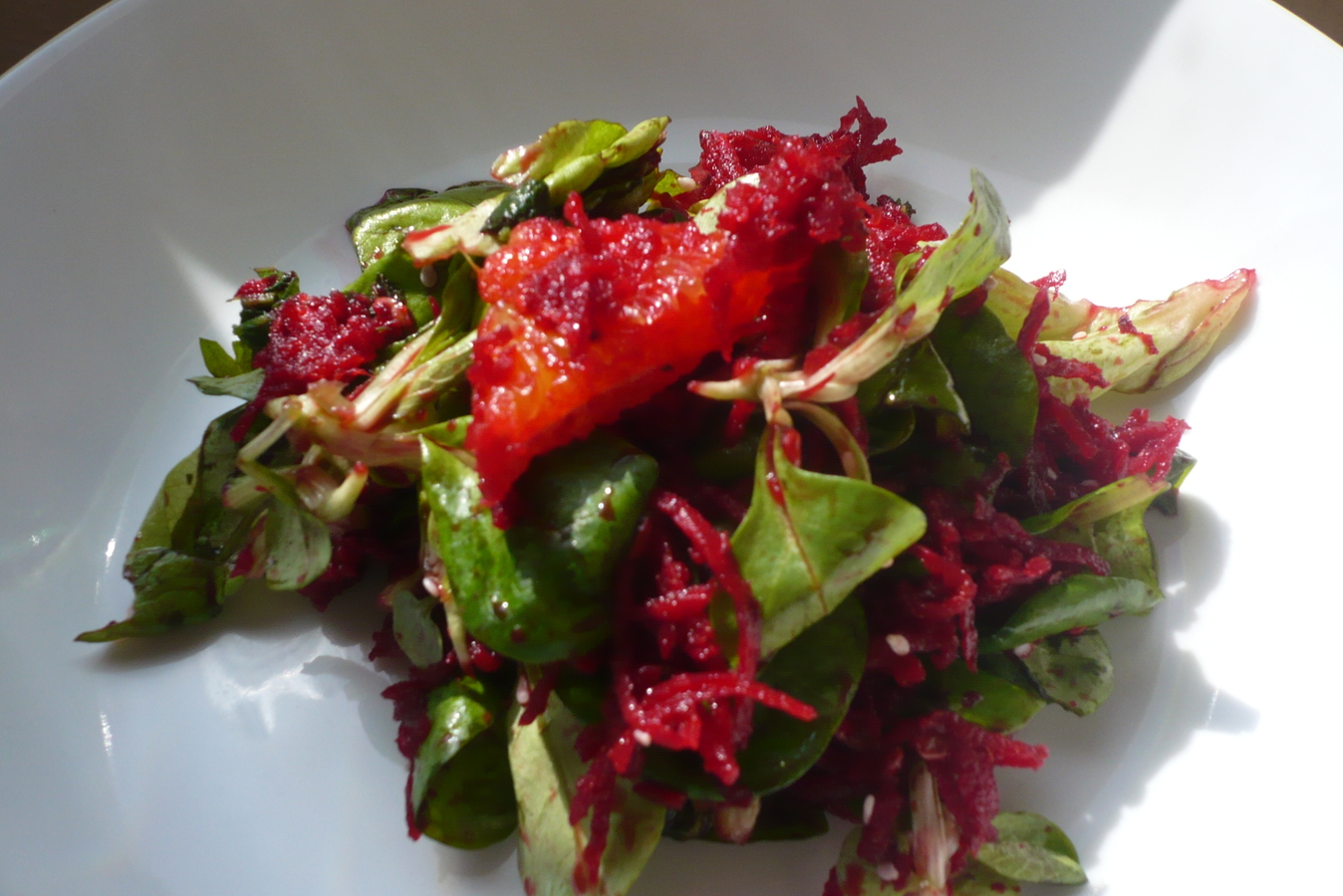 Červenou řepu oloupeme a nastrouháme na jemno. Připravíme si směs salátu např. polníček a hlávkový. Namočená semínka (min. hodinu). Půlku velkého pomeranče vymačkáme a druhou nakrájíme. Spařené kopřivy, řapíkatý celer a fenykl nakrájíme na jemno. Vše smíchejte. Zalijeme sezamovým olejem a červeným vinný octe, lehce přislazeným.