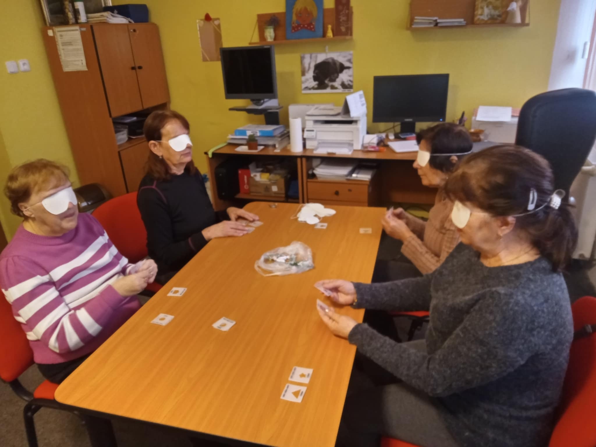 Tuto hru pro nevidomé vytvořil Václav Fanta, který je taktéž nevidomý. Hra obsahuje 64 hracích čtvercových žetonů s různými tvarovými vyseknutými symboly. Těchto symbolů je 8 a každý je zastoupen 8x. Principem hry je pro hráče získávat co nejvyšší počet dvojic až osmic žetonů stejných tvarů. Poprvé jsme si hru jako nováčci vyzkoušeli otevřeně se zrakem. Poté jsme si slepotu nasimulovali a hráli beze zraku. Užili jsme u toho spoustu legrace a také uvědomění, jak těžké je pro vidoucího člověka beze zraku poznat něco hmatem. Nakonec se nám ale i tak podařilo celou serii odehrát a v budoucnu si hru určitě zase někdy zopakujeme.