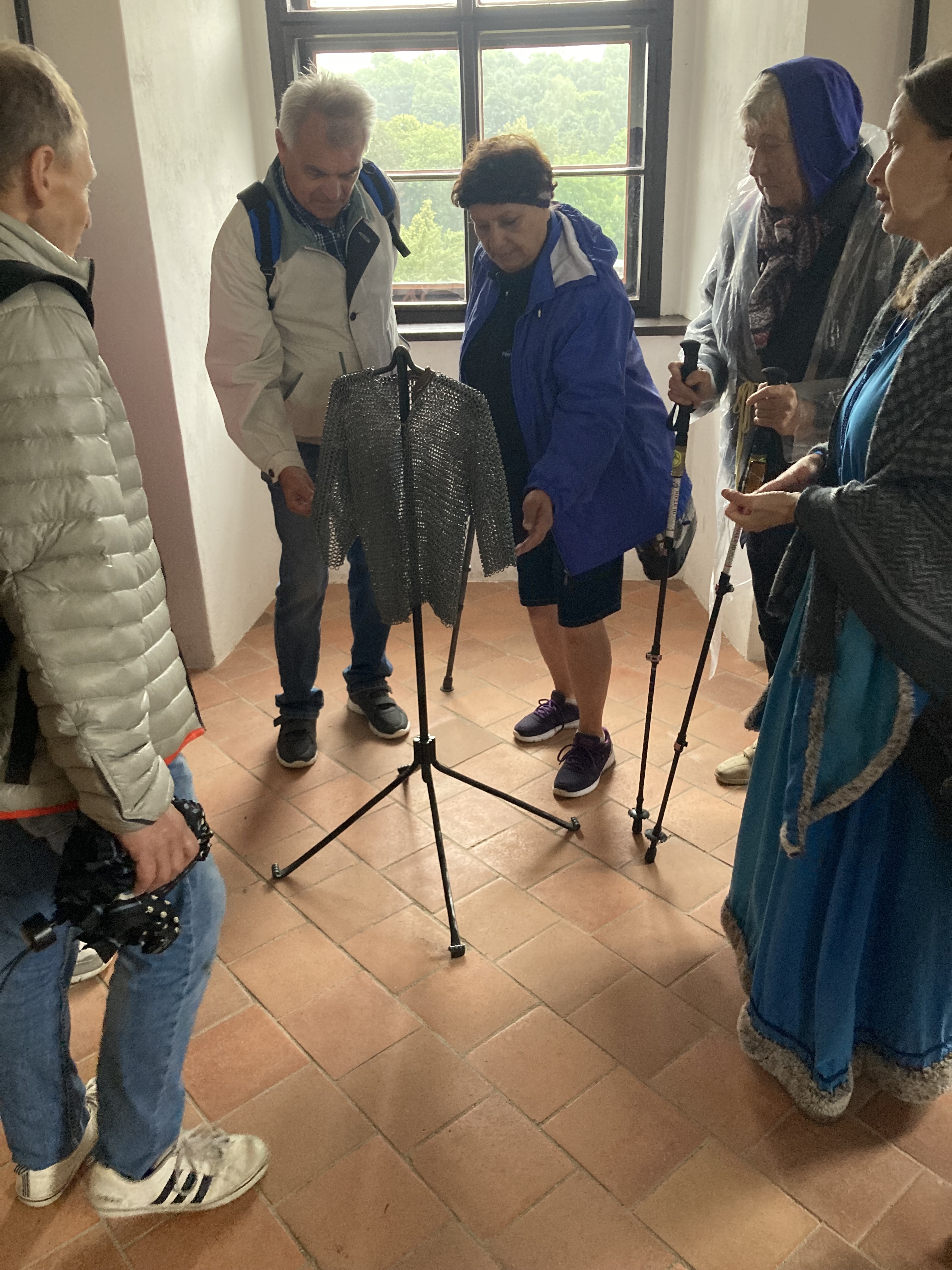 V průběhu komentované prohlídky jsme se díky poutavému vyprávění paní průvodkyně dozvěděli spoustu zajímavých informací o historii i současnosti hradu, prošli jsme si různá tajemná zákoutí, prohlédli rytířský sál, byt nadlesního, dobový nábytek a ti odvážnější nakoukli také do mučírny. Prohlídka byla skutečně stylová nejen dobovými doplňky, ale také oděvy – my v pláštěnkách, paní průvodkyně v kostýmu. Ani po skončení prohlídky déšť neustal, proto jsme se svižně přesunuli zpět k autobusu a vyrazili do nedalekého Jiříkova.