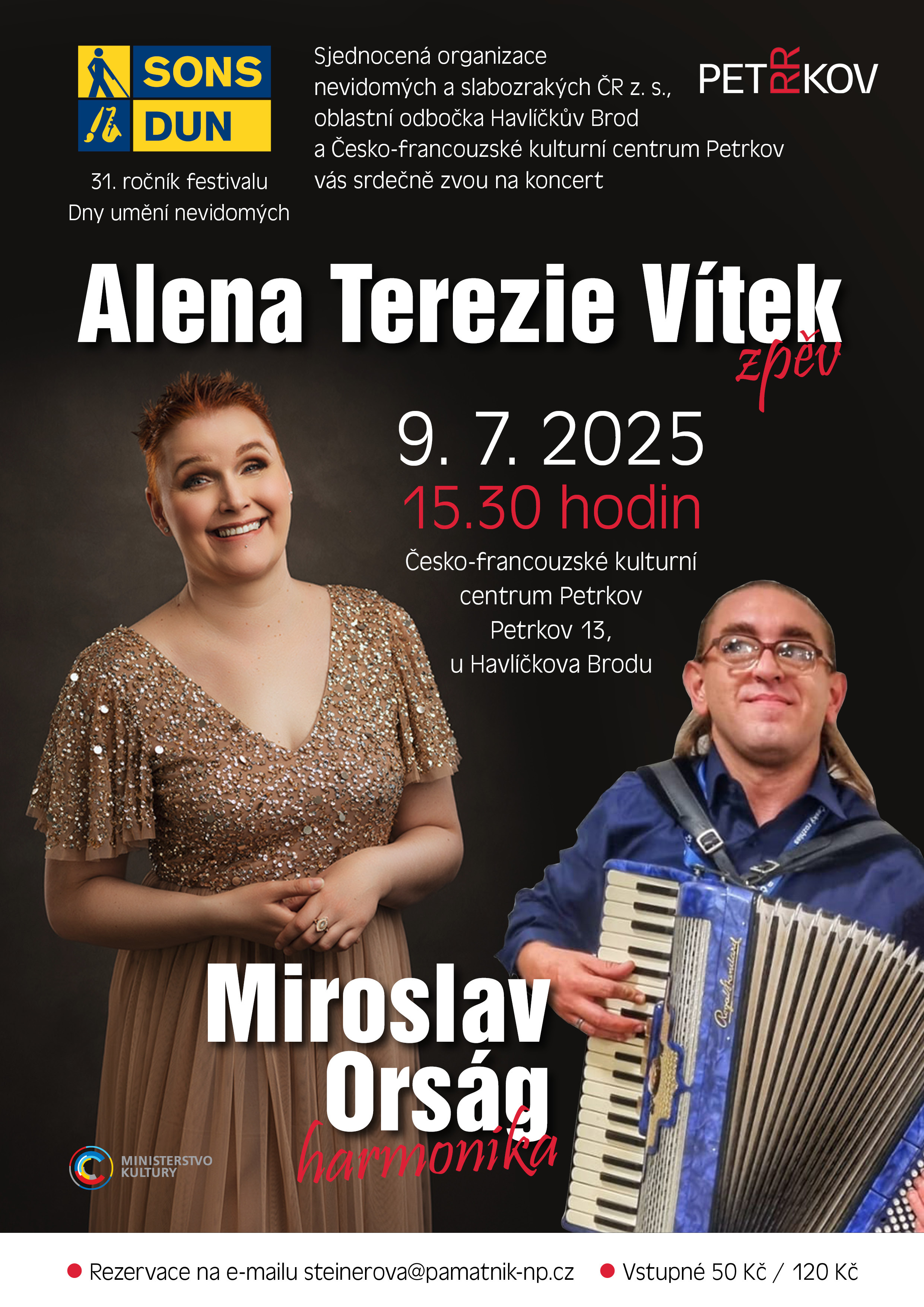 Zveme Vás na koncert operní pěvkyně Aleny Terezie Vítek a akordeonisty Miroslava Orsága, který se koná v rámci 31. ročníku festivalu Dny umění nevidomých.