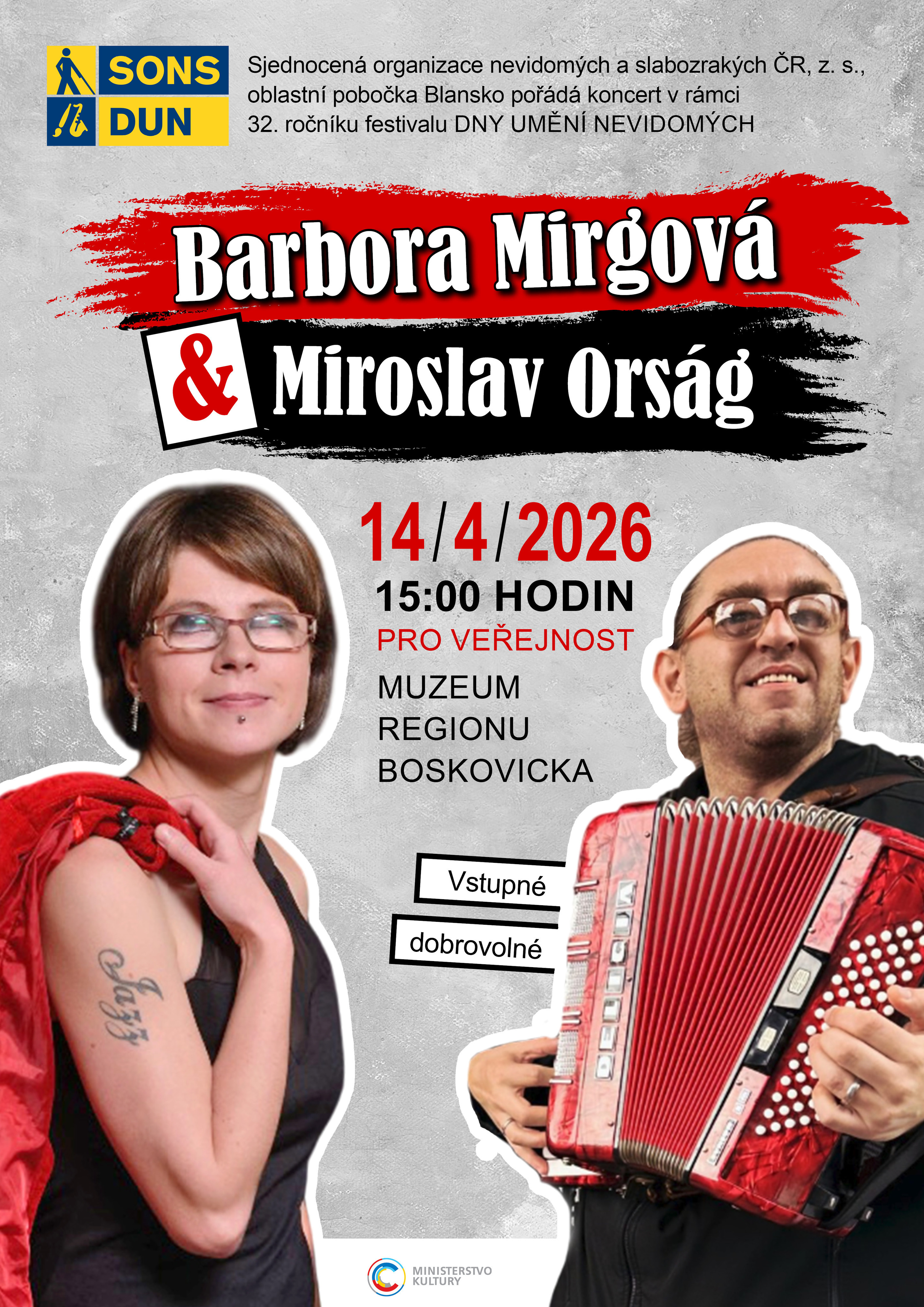 Zveme Vás na koncert zpěvačky Barbory Mirgové a akordeonisty Miroslava Orsága, který se koná v rámci 32. ročníku festivalu Dny umění nevidomých.