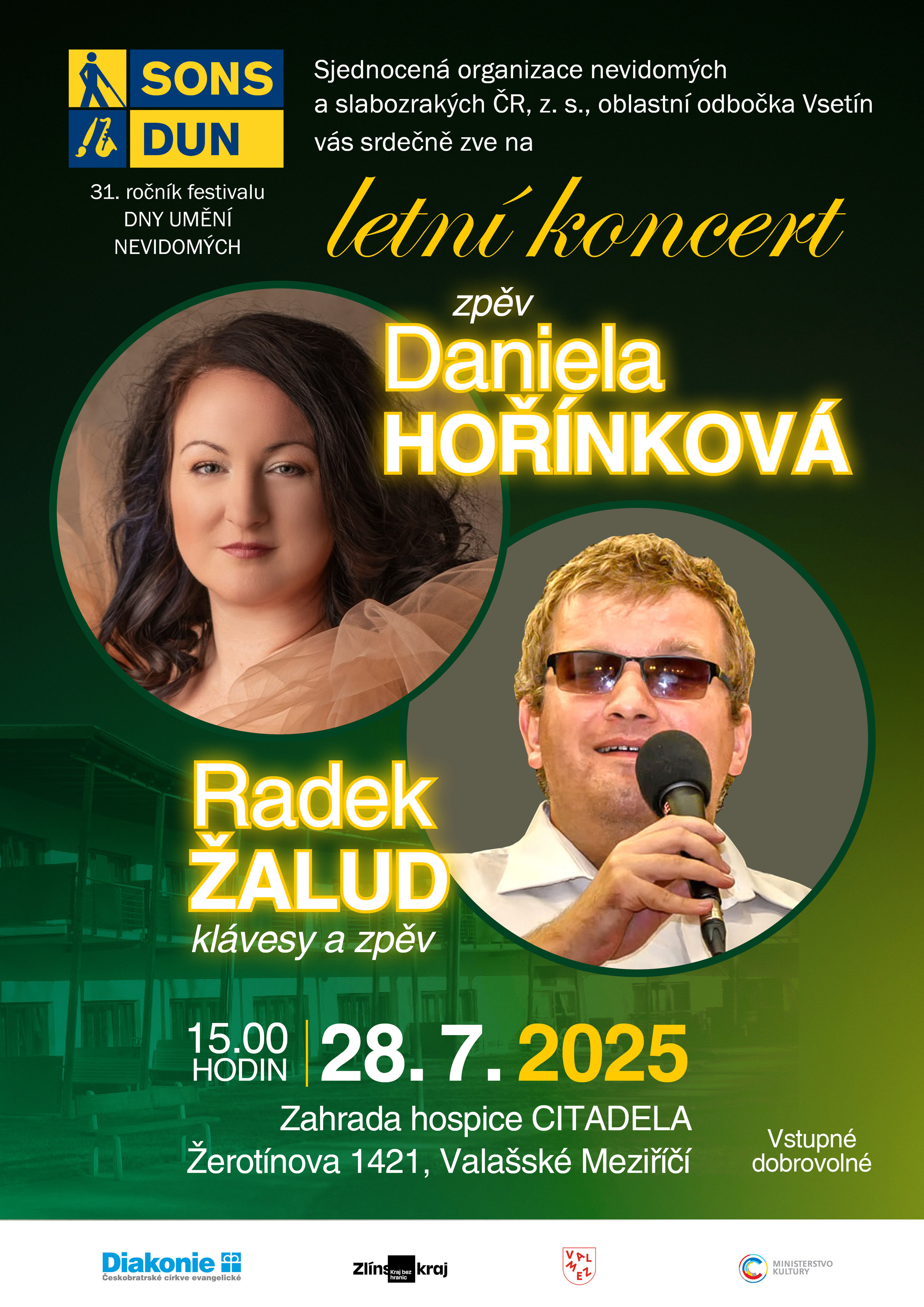 Zveme Vás na koncert zpěvačky Daniely Hořínkové a zpěváka a klávesisty Radka Žaluda, který se koná v rámci 31. ročníku festivalu Dny umění nevidomých.