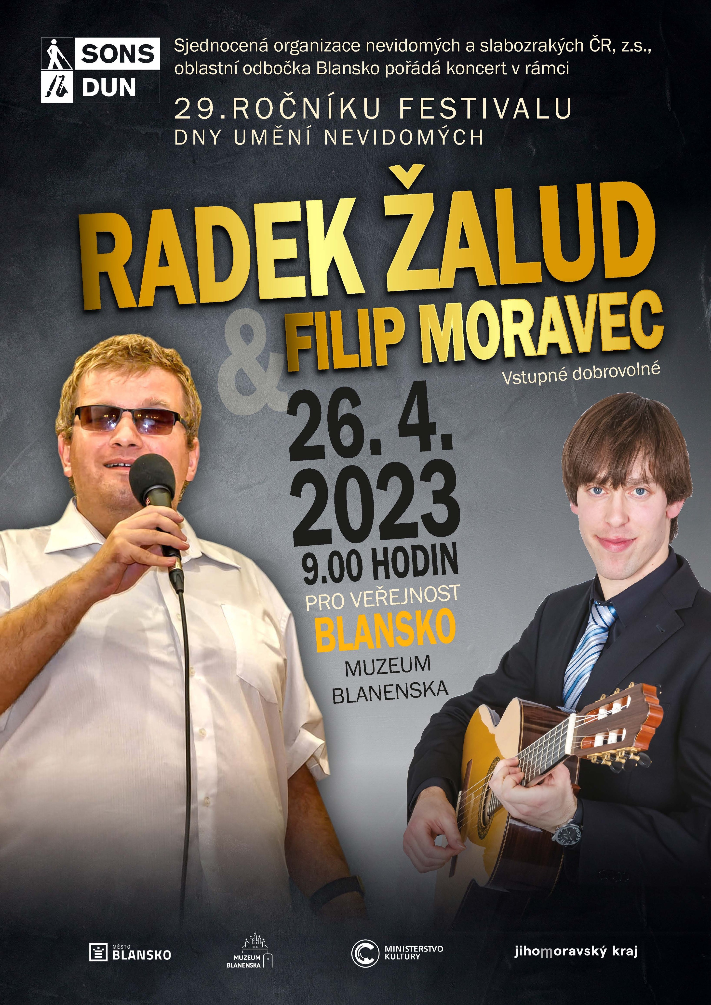 Zveme Vás na koncert zpěváka Radka Žaluda a kytaristy Filipa Moravce, který proběhne v rámci 29. ročníku festivalu Dny umění nevidomých.