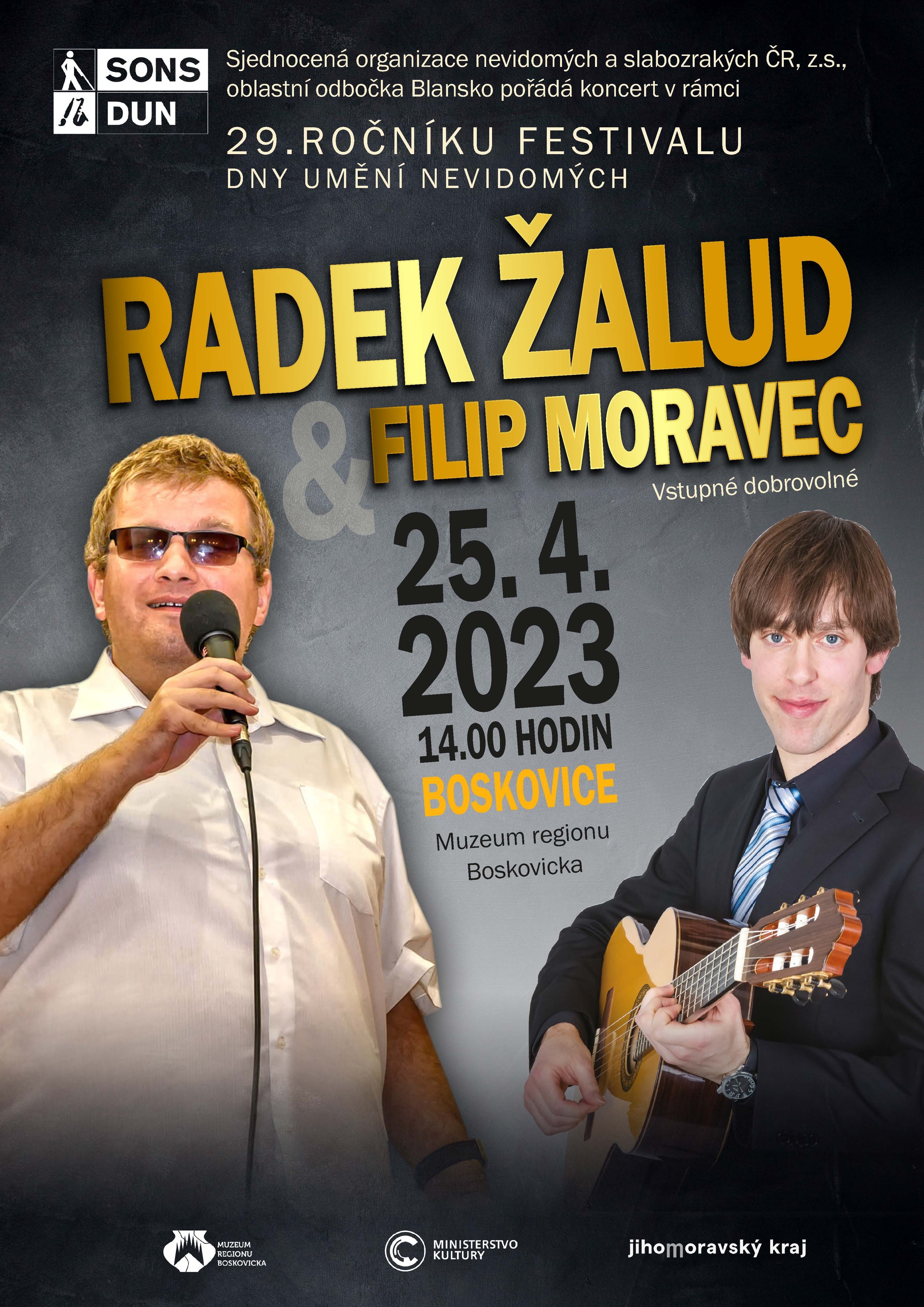 Zveme Vás na koncert zpěváka Radka Žaluda a kytaristy Filipa Moravce, který proběhne v rámci 29. ročníku festivalu Dny umění nevidomých.