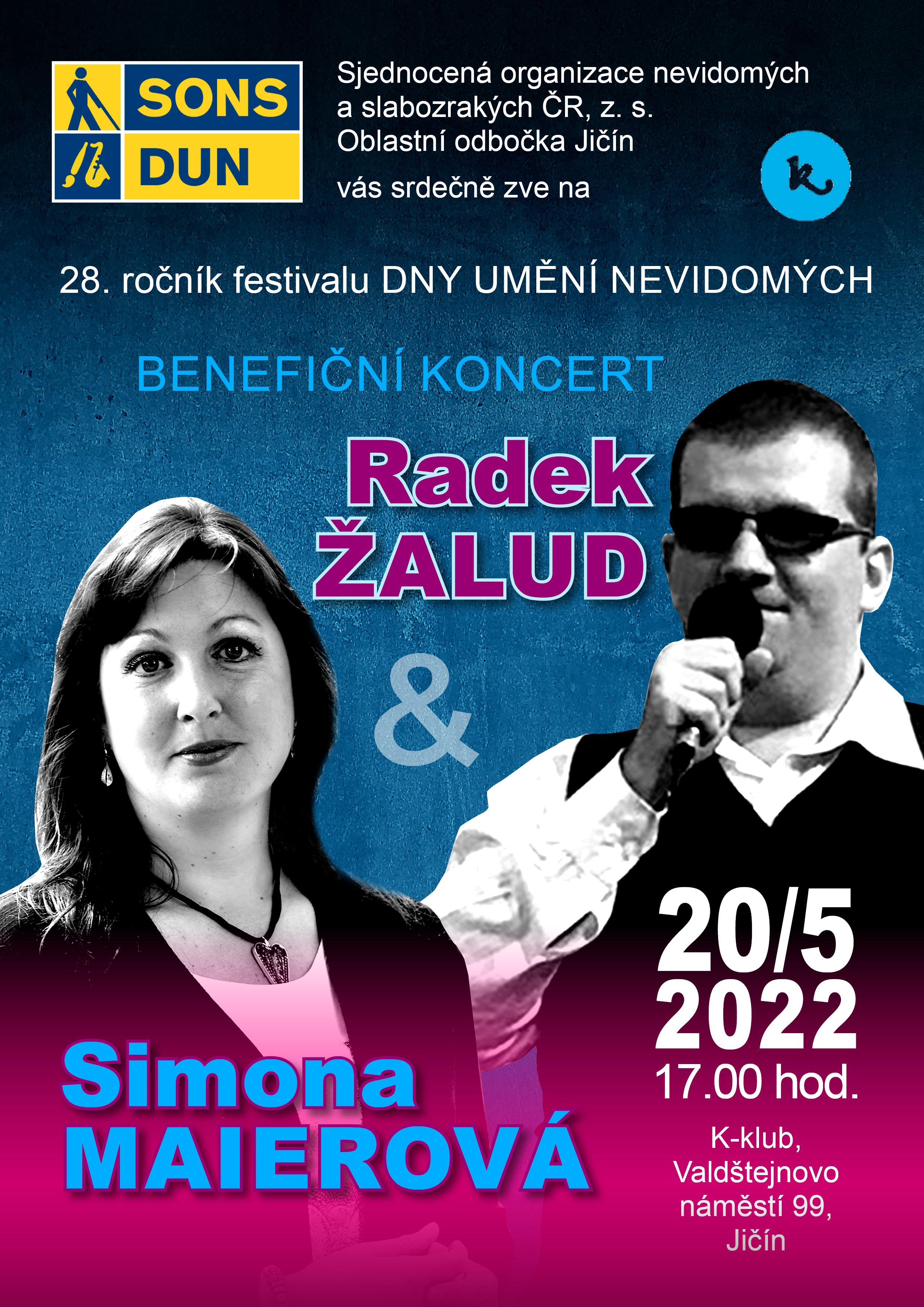 Zveme Vás na benefiční koncert Radka Žaluda a Simony Maierové, který se uskuteční v rámci 28. ročníku festivalu Dny umění nevidomých v K-klubu na Valdštejnově náměstí v Jičíně.