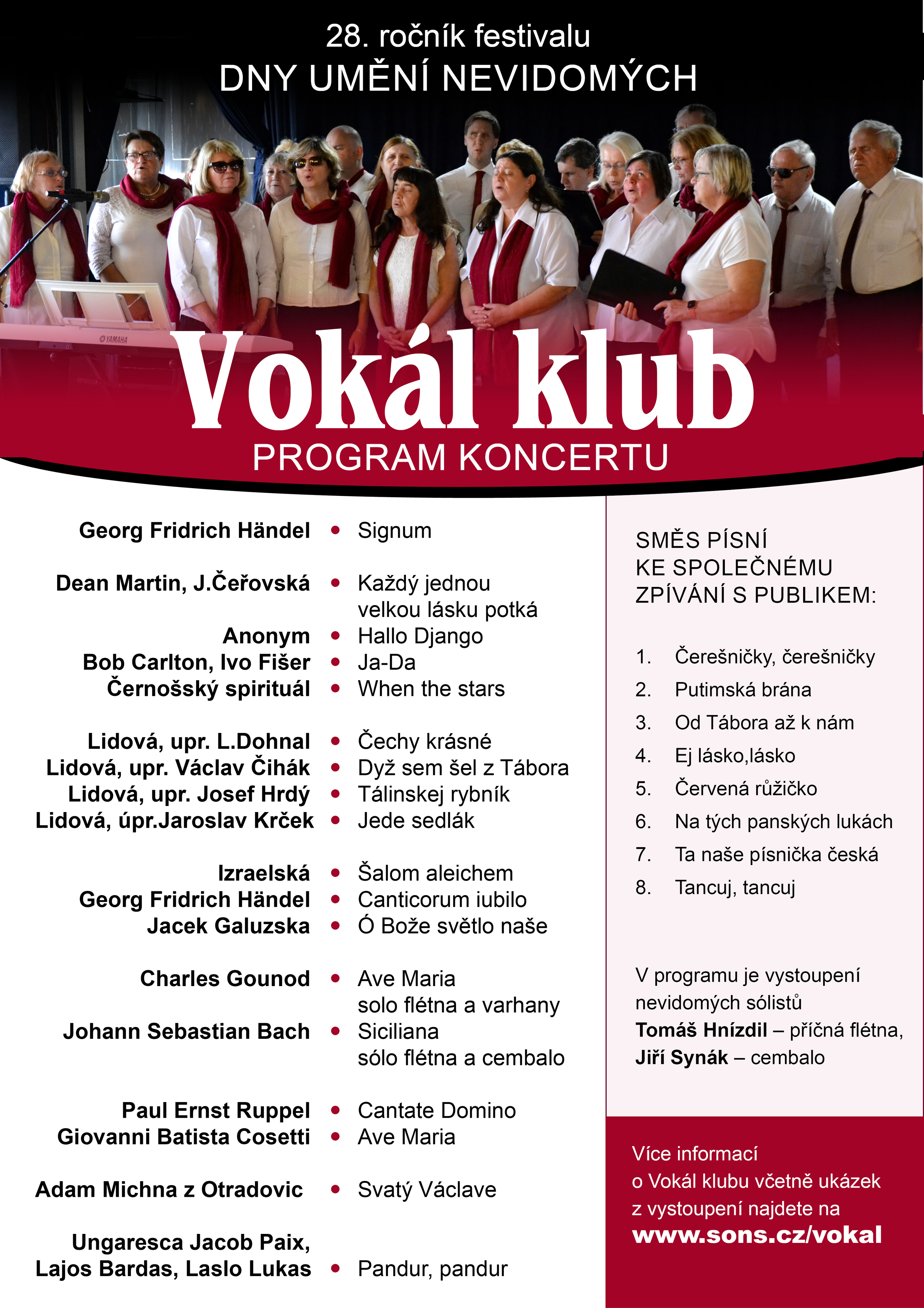 Zveme Vás na koncert Vokál klubu - pěveckého sboru zrakově postižených, který se koná v rámci 28. ročníku festivalu Dny umění nevidomých v domově pro zrakově postižené Palata v Praze 5.