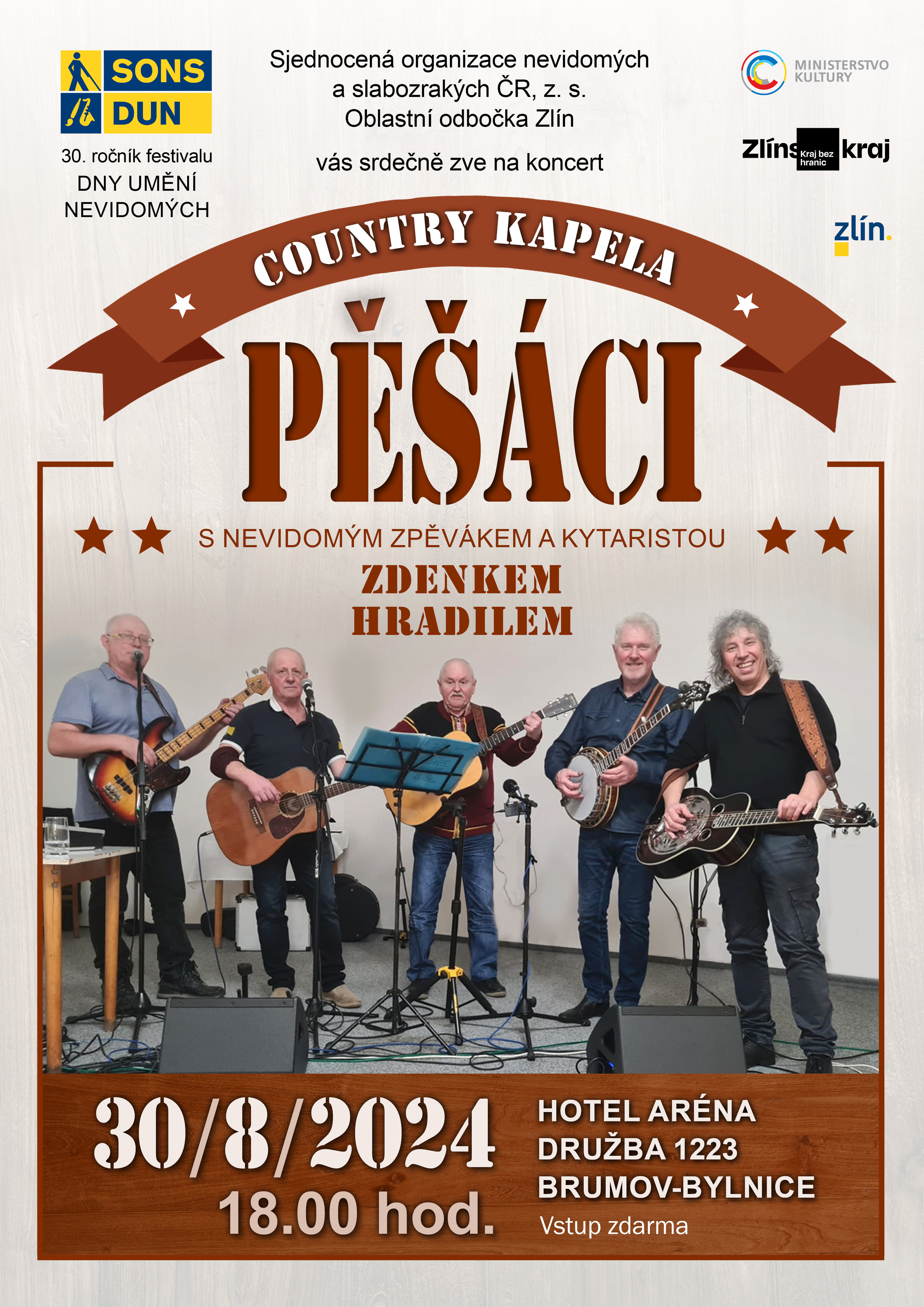 Zveme Vás na koncert country kapely Pěšáci s nevidomým kytaristou a zpěvákem Zdenkem Hradilem. Koncert se koná v rámci 30. ročníku festivalu Dny umění nevidomých