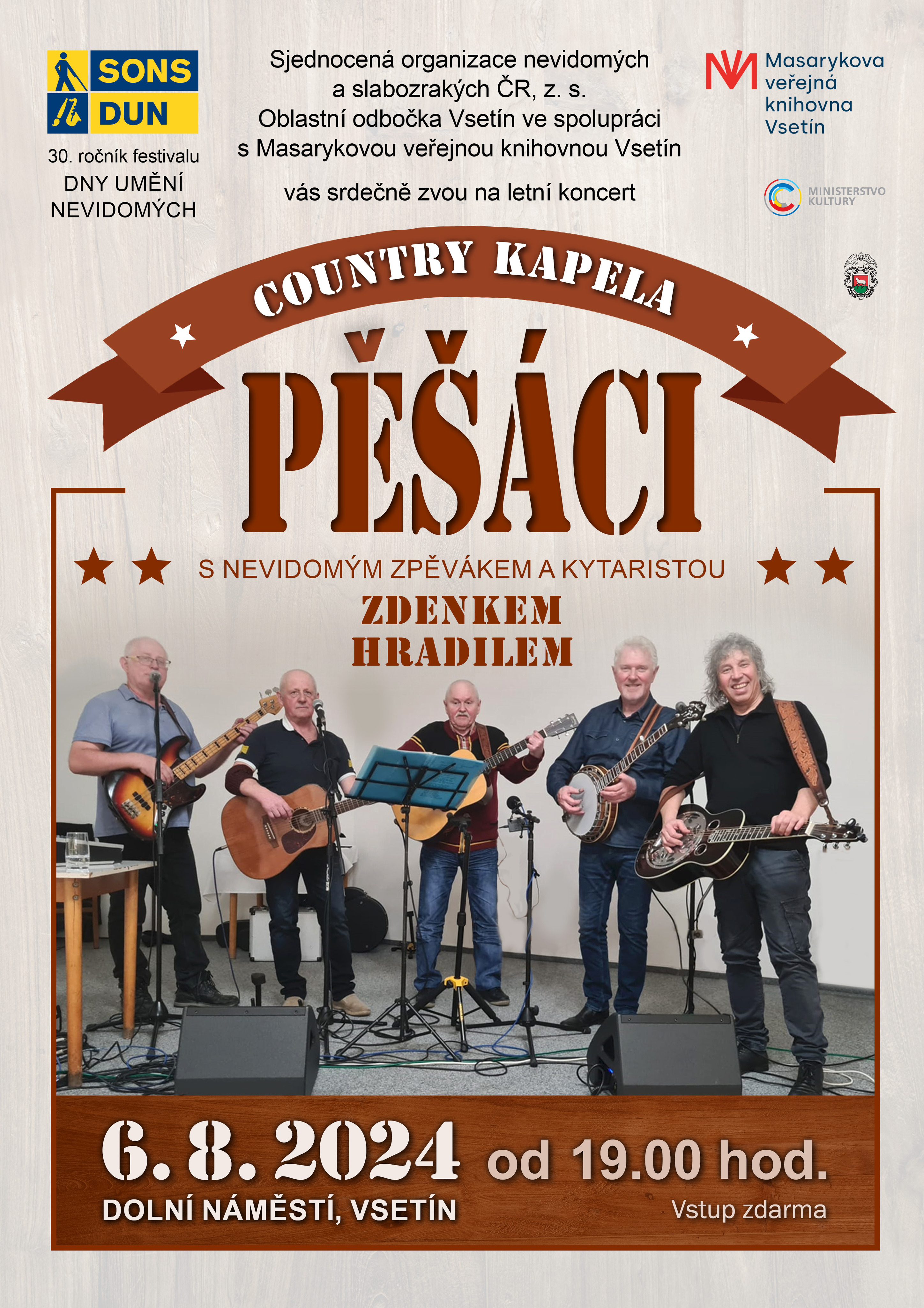 Zveme Vás na koncert country kapely Pěšáci s nevidomým kytaristou a zpěvákem Zdenkem Hradilem. Koncert se koná v rámci 30. ročníku festivalu Dny umění nevidomých ve splupráci s Masarykovou veřejnou knihovnou Vsetín a za finanční podpory Ministerstva kultury ČR a města Vsetín.