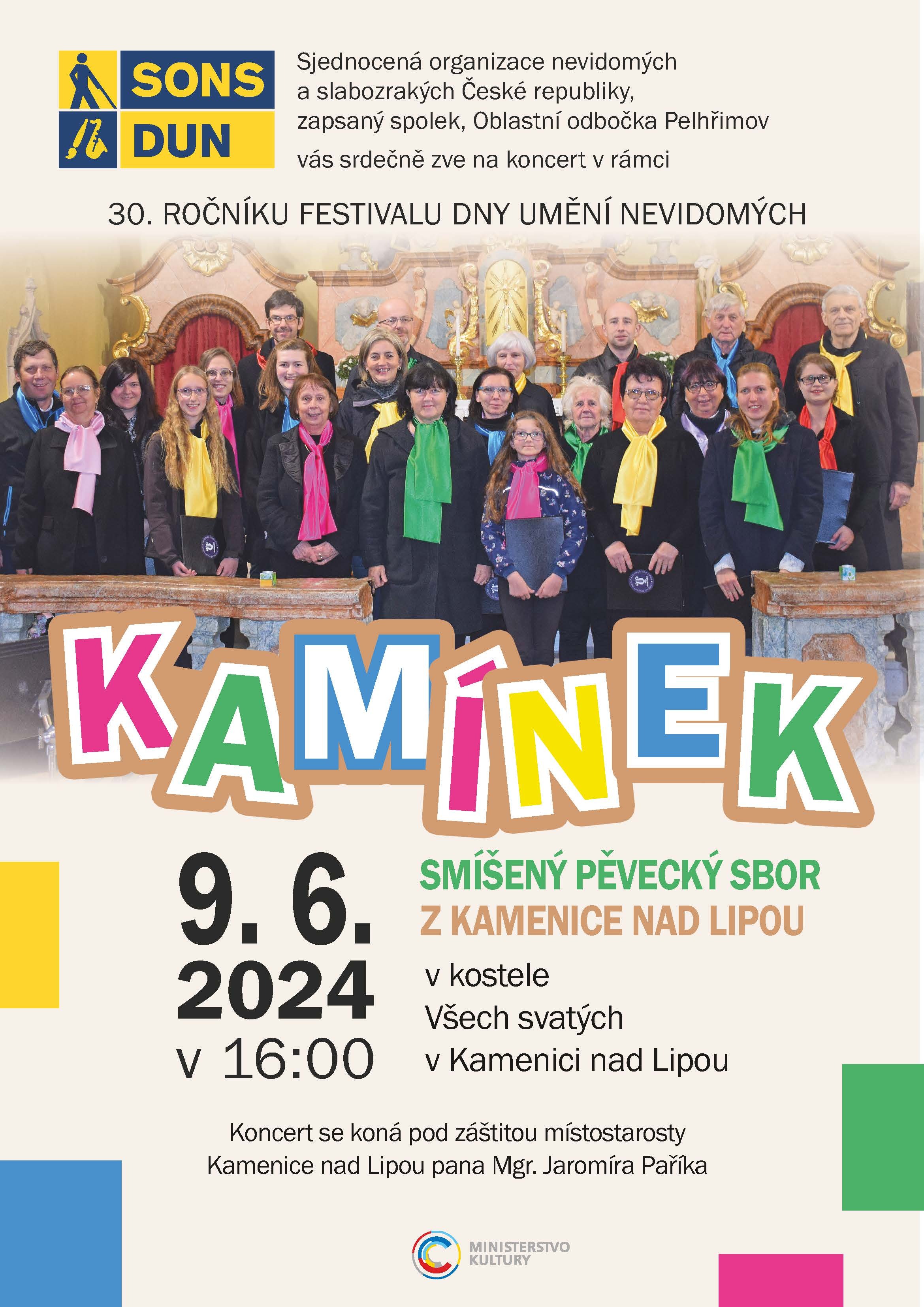 Zveme Vás na koncert smíšeného pěveckého sboru Kamínek z Kamenice nad Lipou, který se koná v rámci 30. ročníku festivalu Dny umění nevidomých.