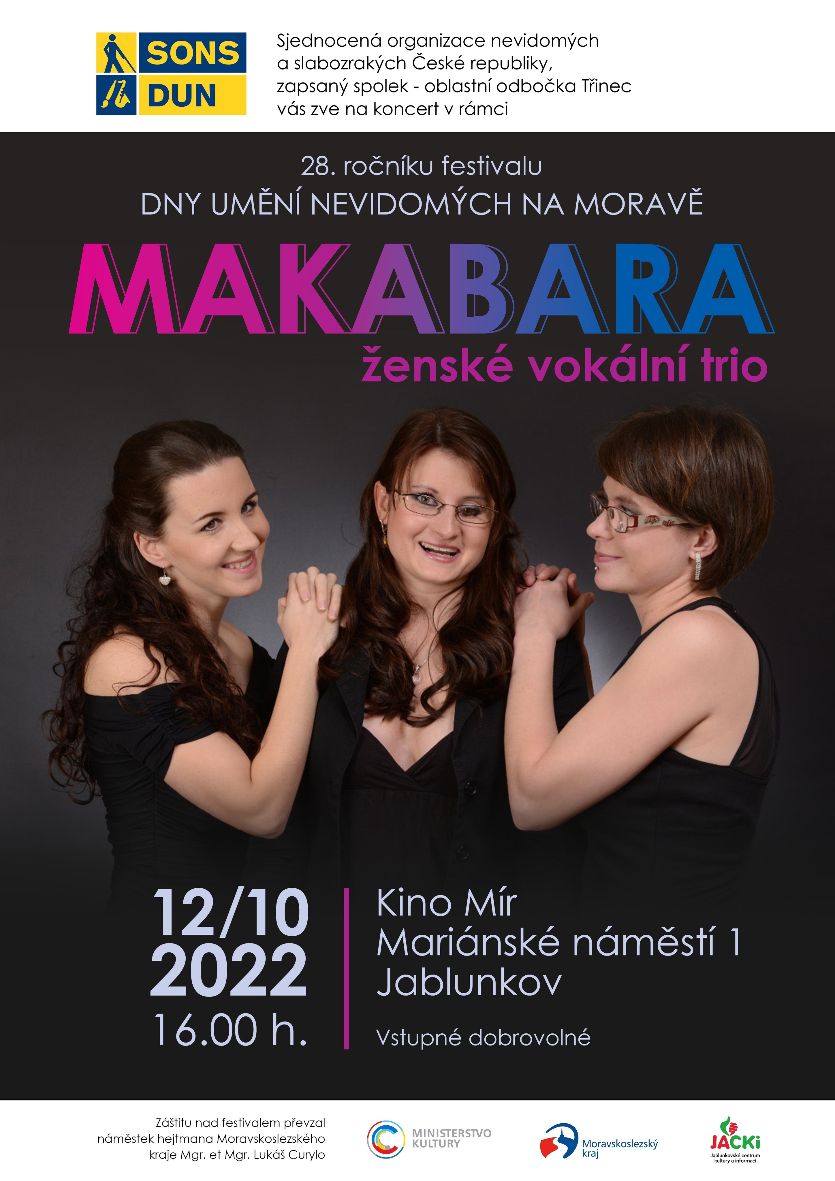 Zveme Vás na koncert tria Makabara, který se koná v úterý 12. 10. 2022 v kině Mír v Jablůnkově. Koncert se koná v rámic 28. ročníku festivalu Dny umění nevidomých na Moravě.
