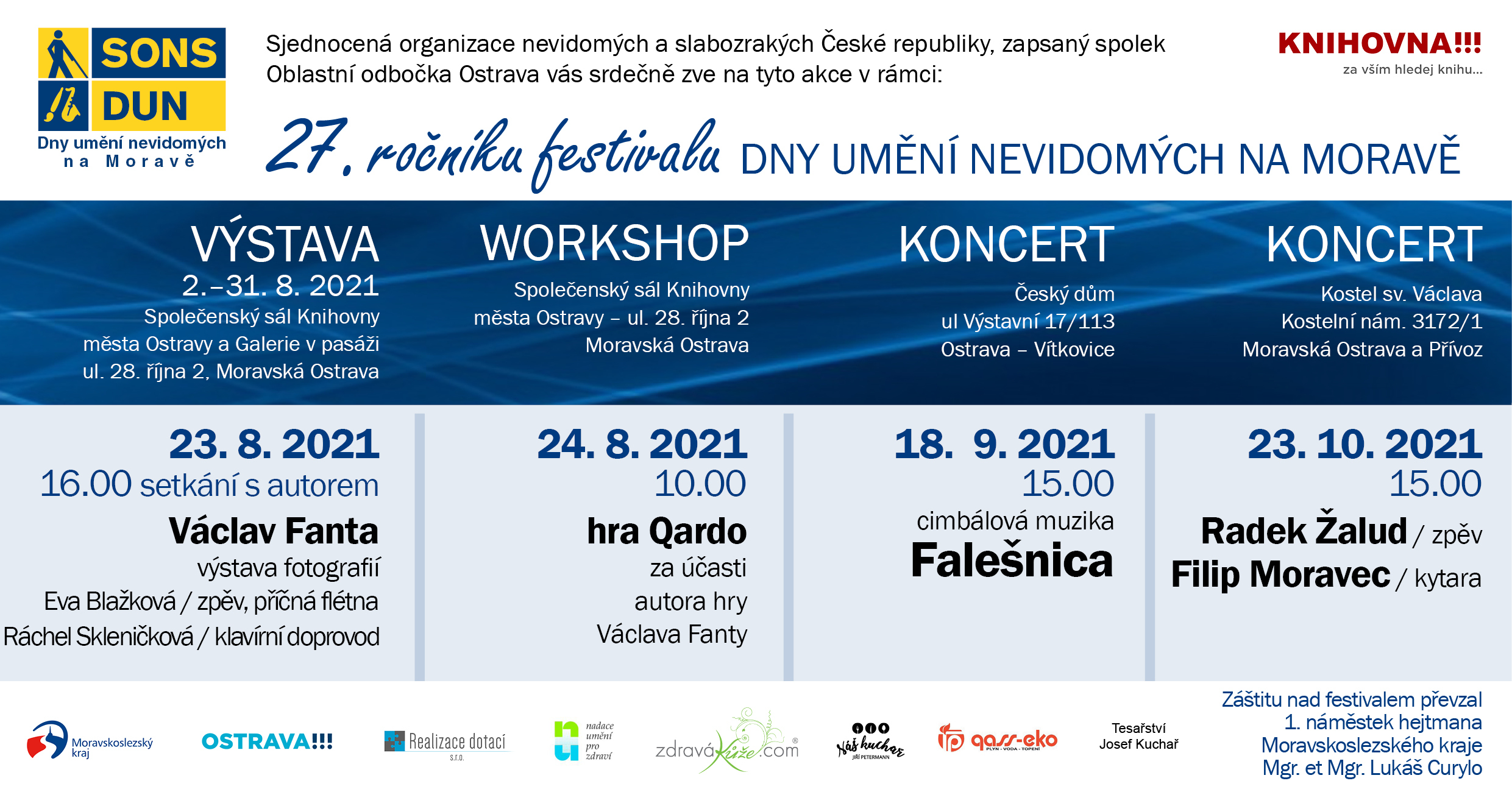 s potěšním vás zveme na 27. ročník festivalu Dny umění nevidomých na Moravě, který zahájíme dne 23.08.2021 v 16:00 hodin setkáním s autorem hry QUARDO, které se uskuteční v Knihovně města Ostravy. Celý program naleznete v přiloženém plakátu.