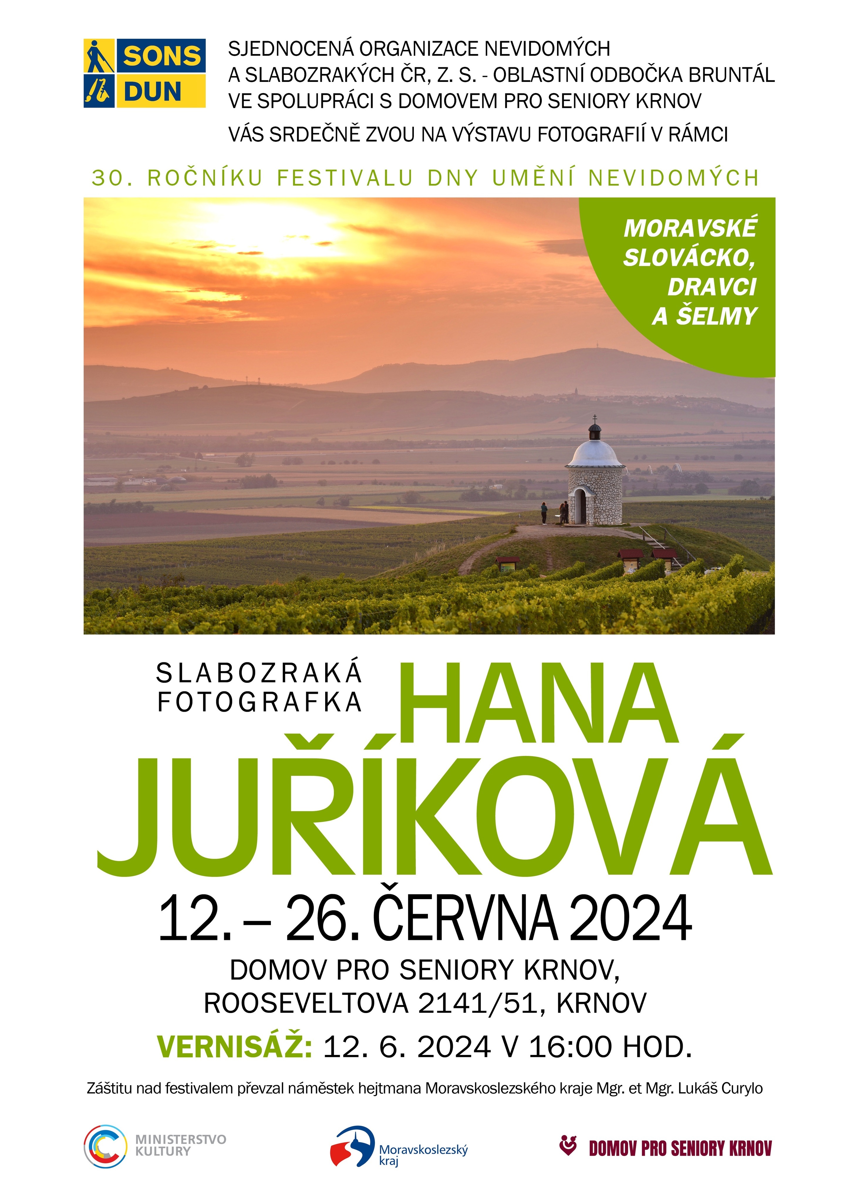 Zveme Vás na výstavu fotografií slabozraké fotografky Hany Juříkové s názvem "Moravské Slovácko, dravci a šelmy", která se koná v rámci 30. ročníku festivalu Dny umění nevidomých.