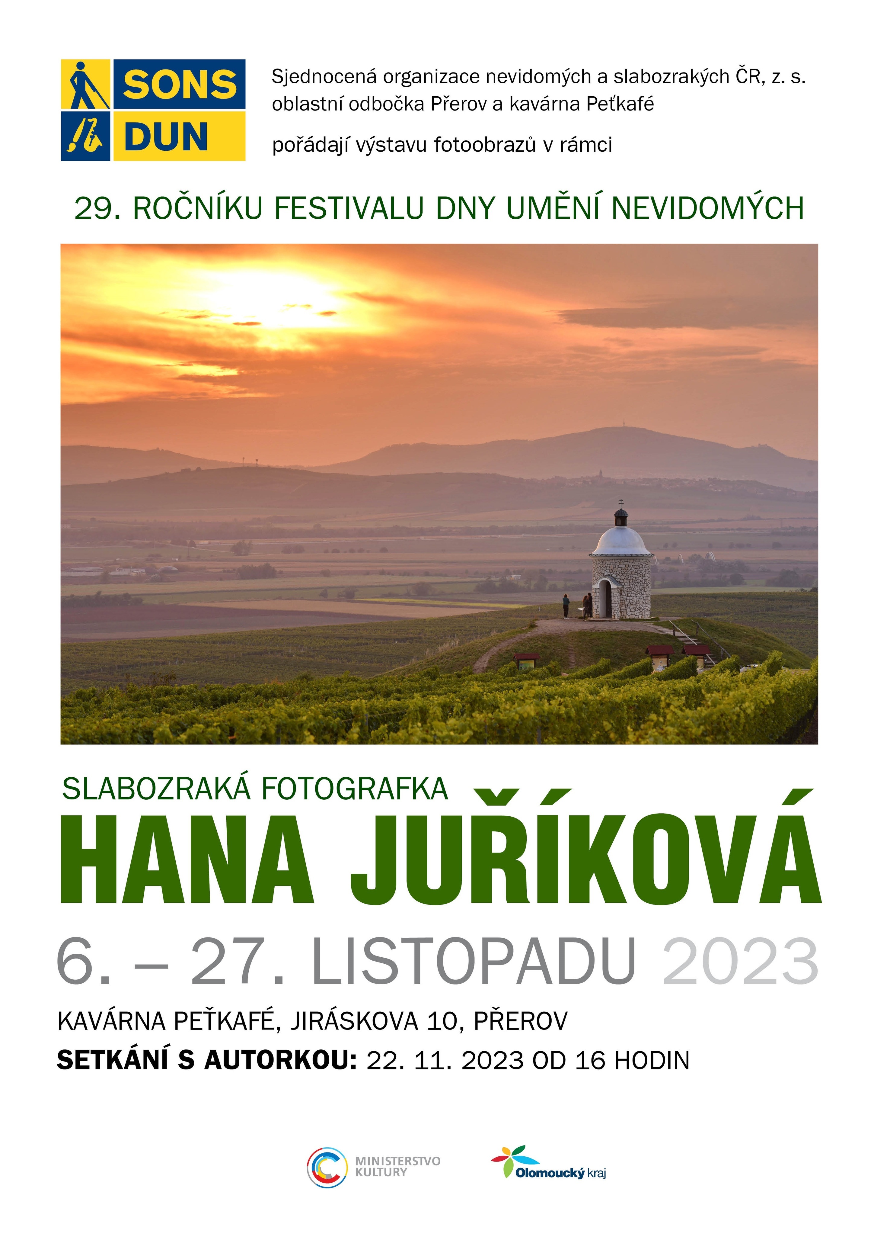 V rámci 29. ročníku festivalu Dny umění nevidomých na Moravě si můžete přerovské kavárně PEŤKAFÉ prohlédnout výstavu fotografií slabozraké autorky Hany Juříkové, která žije a pracuje v Přerově.