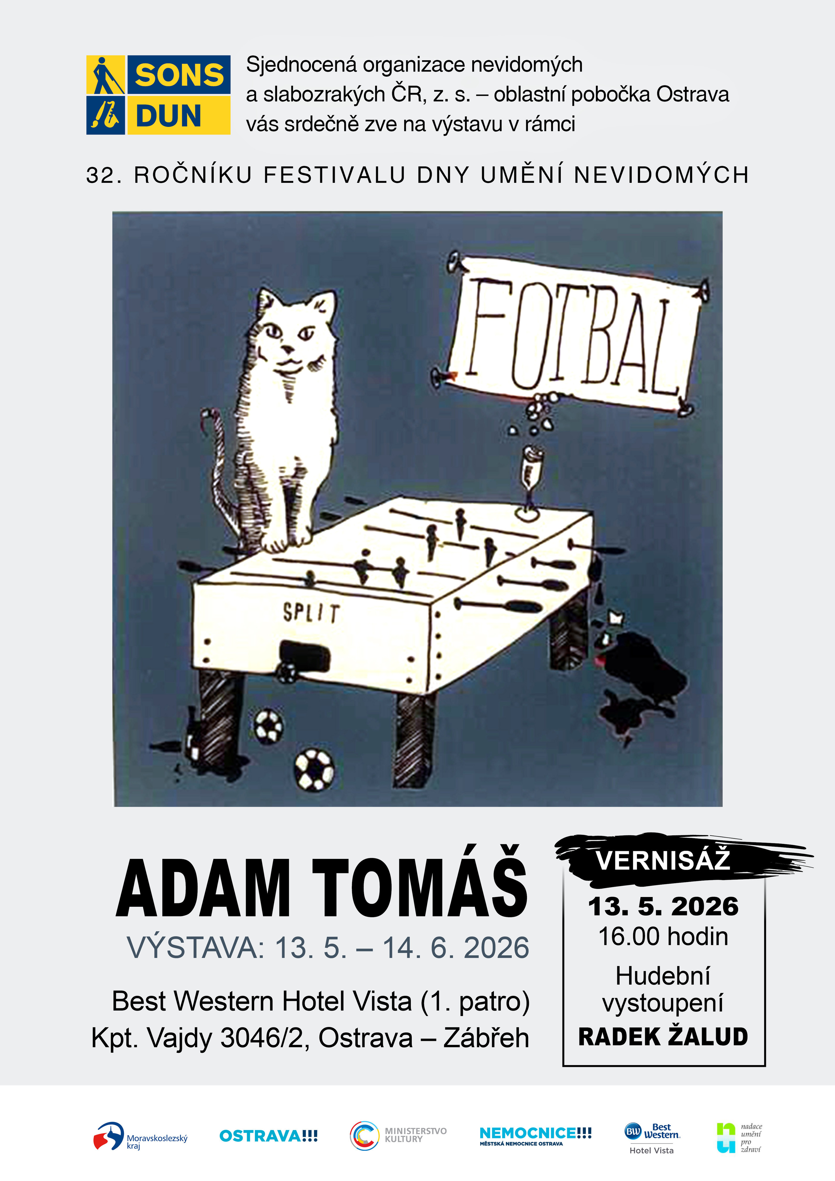 Výstava bude zahájena vernisáží ve středu 13. 5. 2026 od 15:00 hodin. Její součástí bude také hudební vystoupení zpěváka Radka Žaluda.