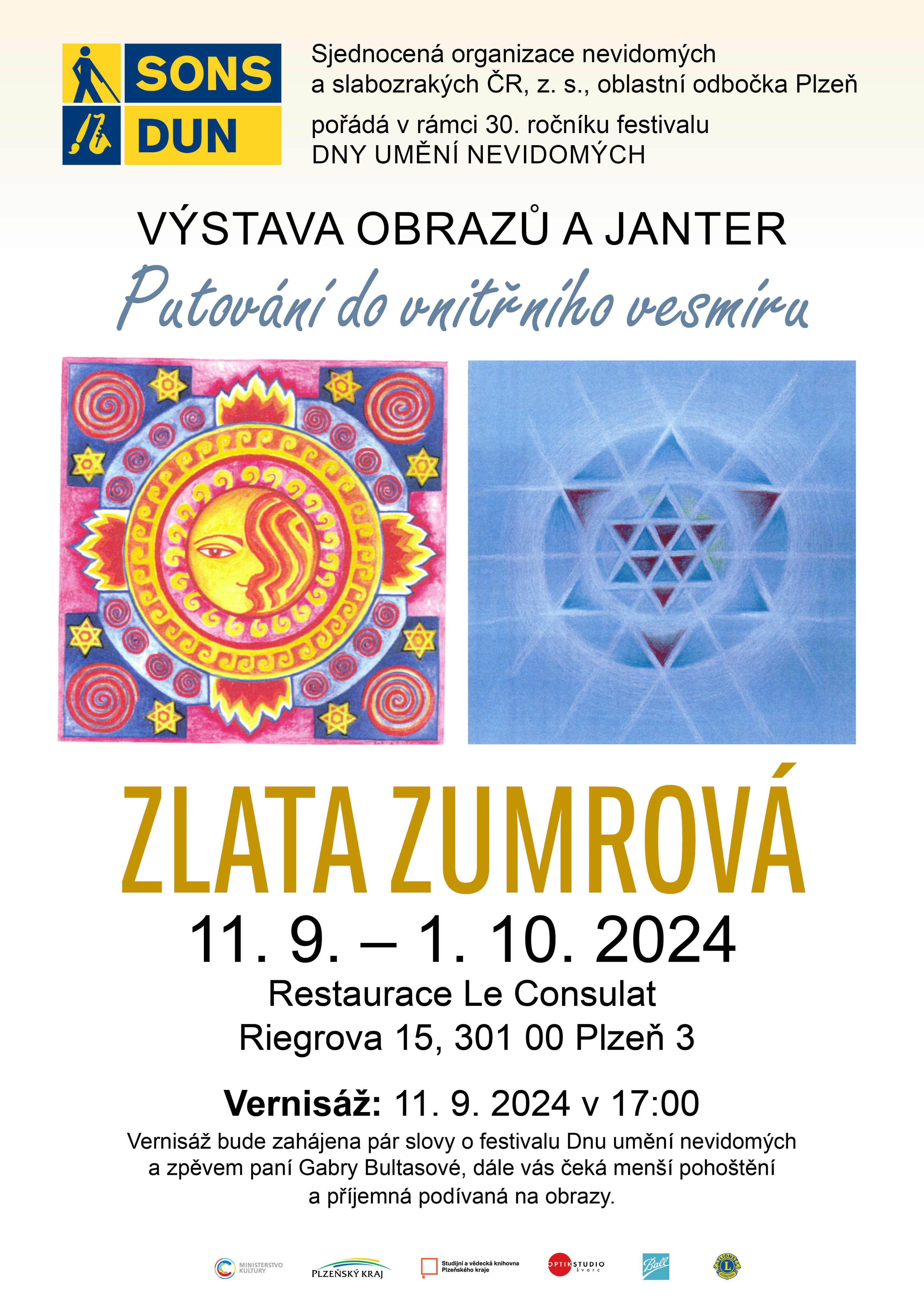 Zveme Vás na výstavu obrazů a janter Zlaty Zumrové s názvem "Putování do vnitřního vesmíru", která se koná v rámci 30. ročníku festivalu Dny umění nevidomých.