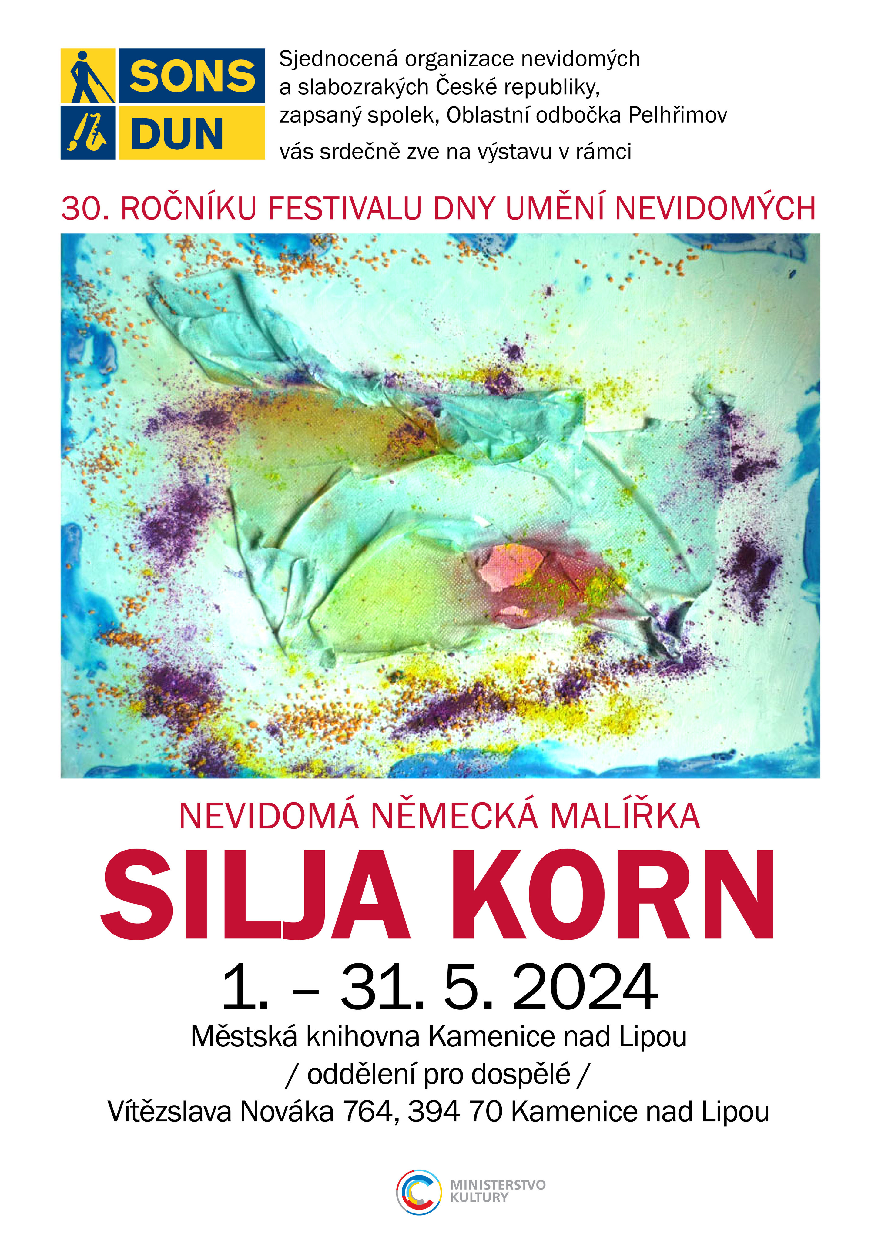 Zveme Vás na výstavu nevidomé neměcké malířky Silji Korn, která probíhá v rámci 30. ročníku festivalu Dny umění nevidomých. Výstava obrazů byla v minulých letech k vidění v mnoha moravským městech.