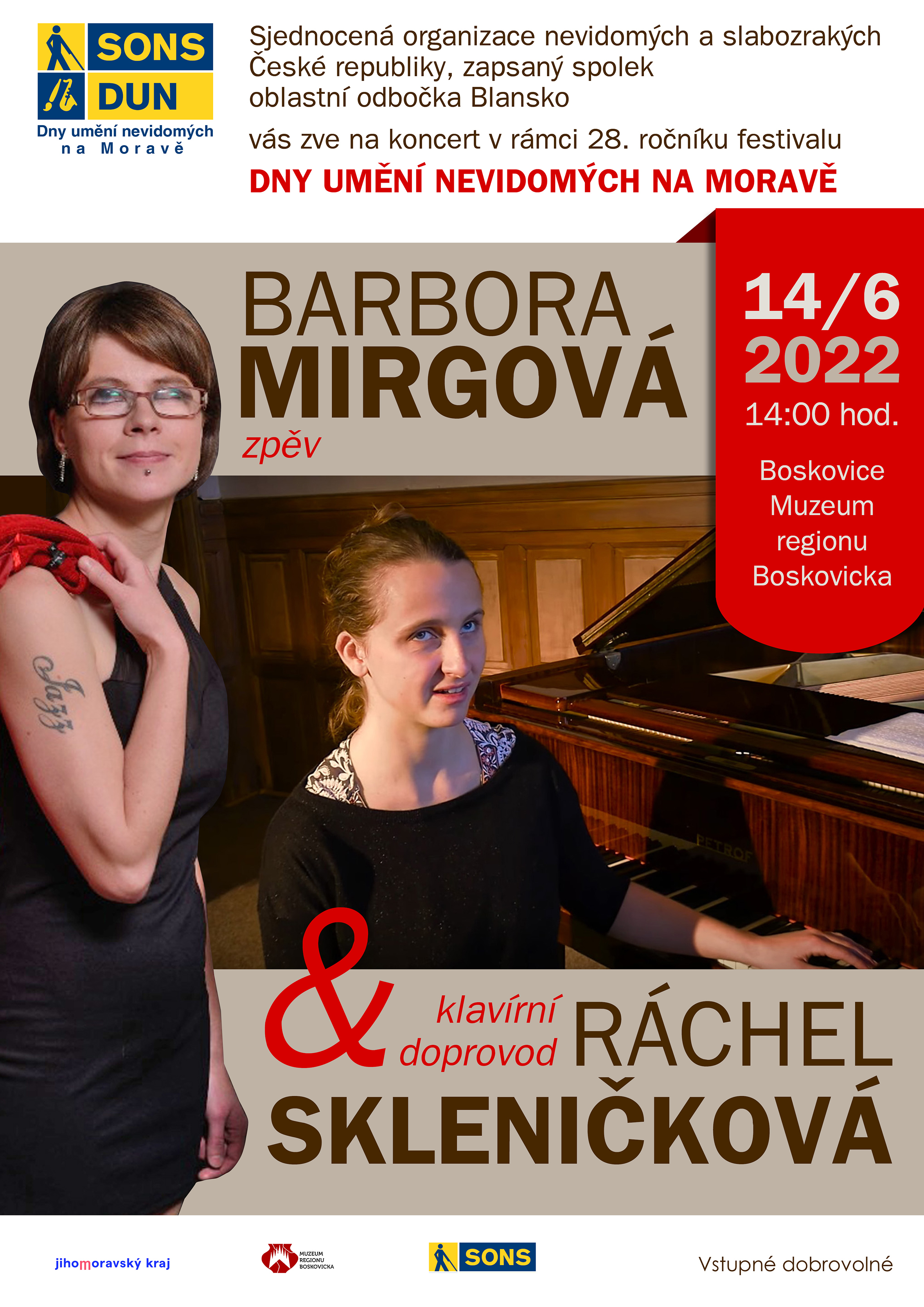 Zveme Vás na koncert zpěvačky Barbory Mirgové za hudebního doprovodu klavíristky Ráchel Skleničkové, který se koná v rámci 28. ročníku festivalu Dny umění nevidomých na Moravě.
