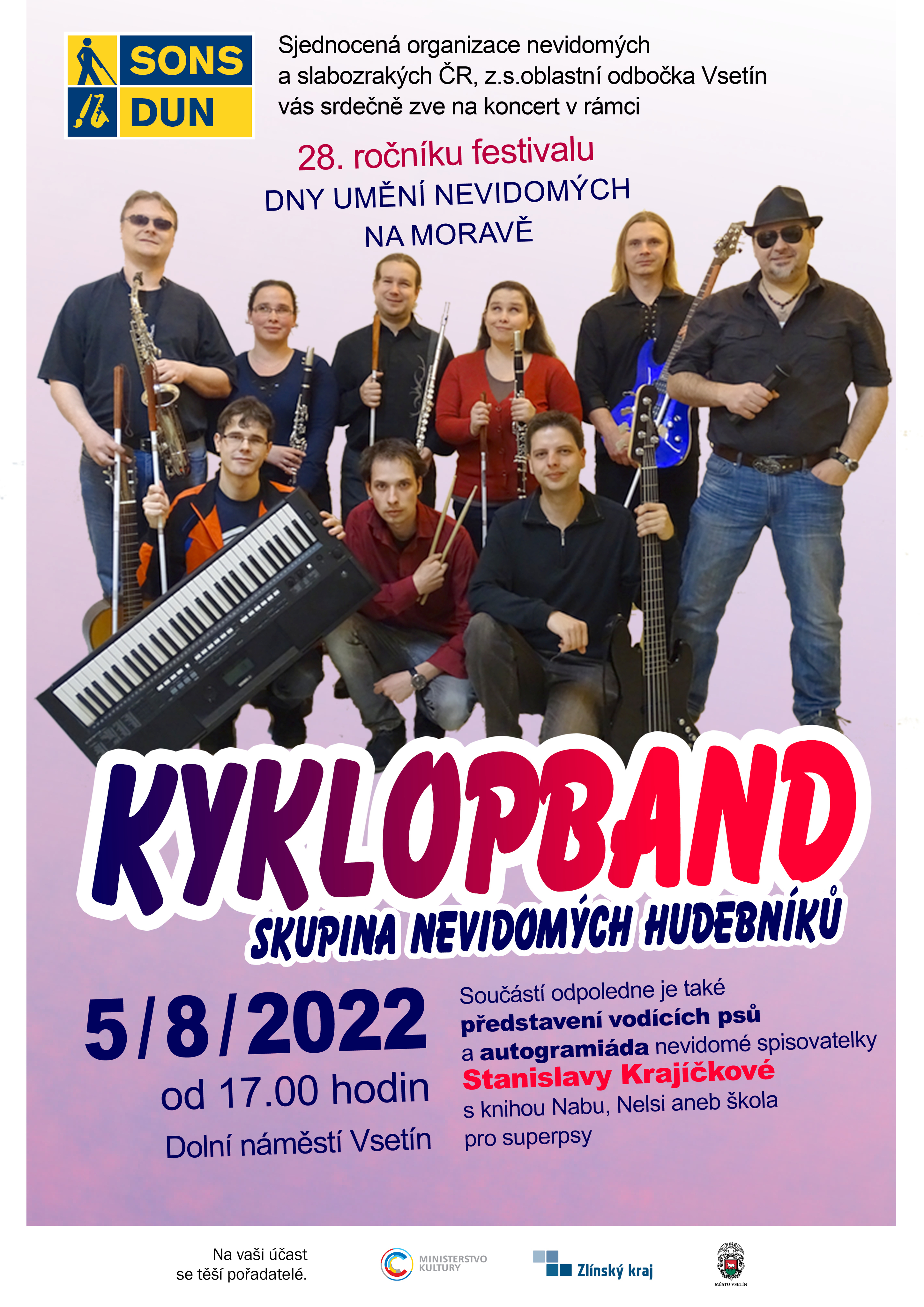 V pátek 5.8.2022 si můžete poslechnout vystoupení hudební skupiny nevidomých Kyklopband ve Vsetíně na Dolním náměstí před knihovnou. Akce je pořádána u příležitosti autogramiády knihy Nabu, Nelsie a škola pro superpsy autorky Stanislavy Krajíčkové. Bližší informace naleznete v přiloženém plakátku.