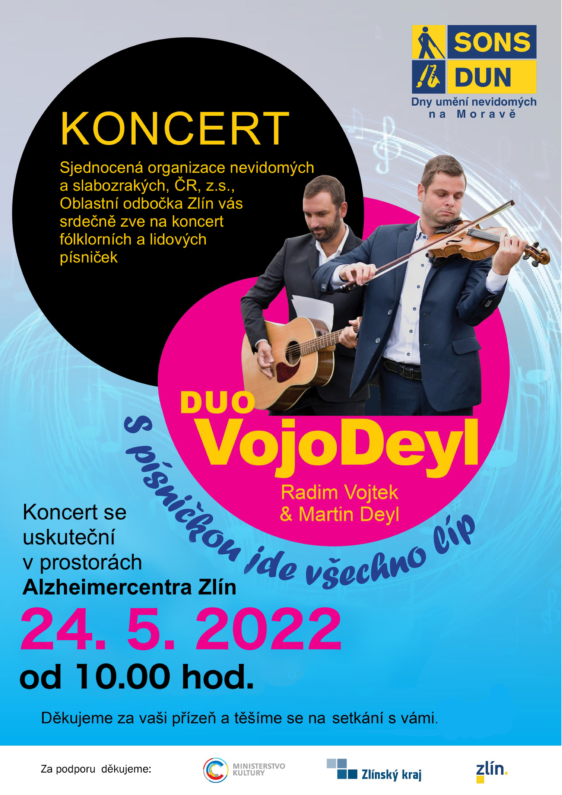 Zveme Vás na koncert Dua VojoDeyl ve zlínském Alzheimercentru. Poslechnout si můžete lidové a folklórní písně v podání kytary a houslí.