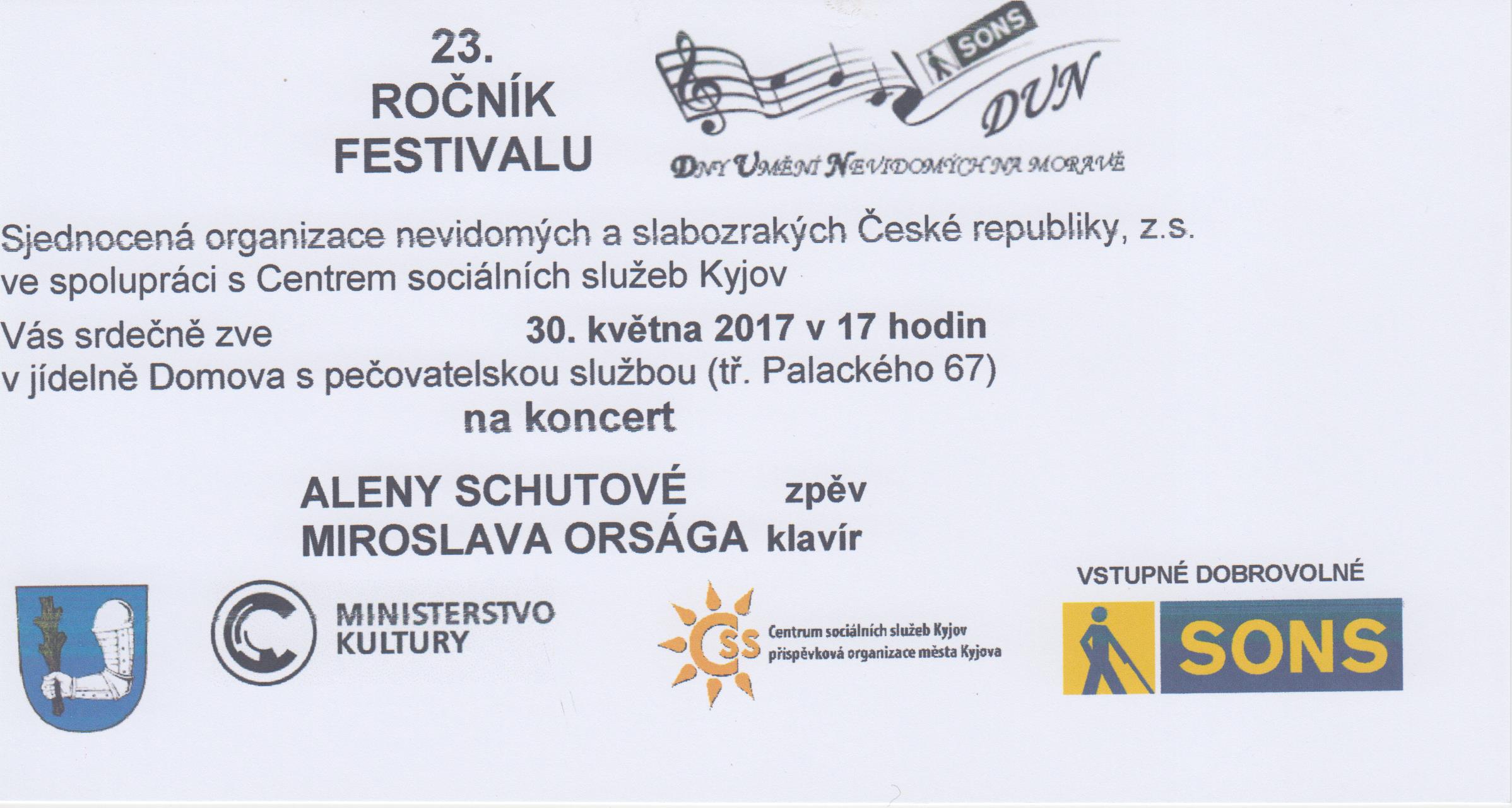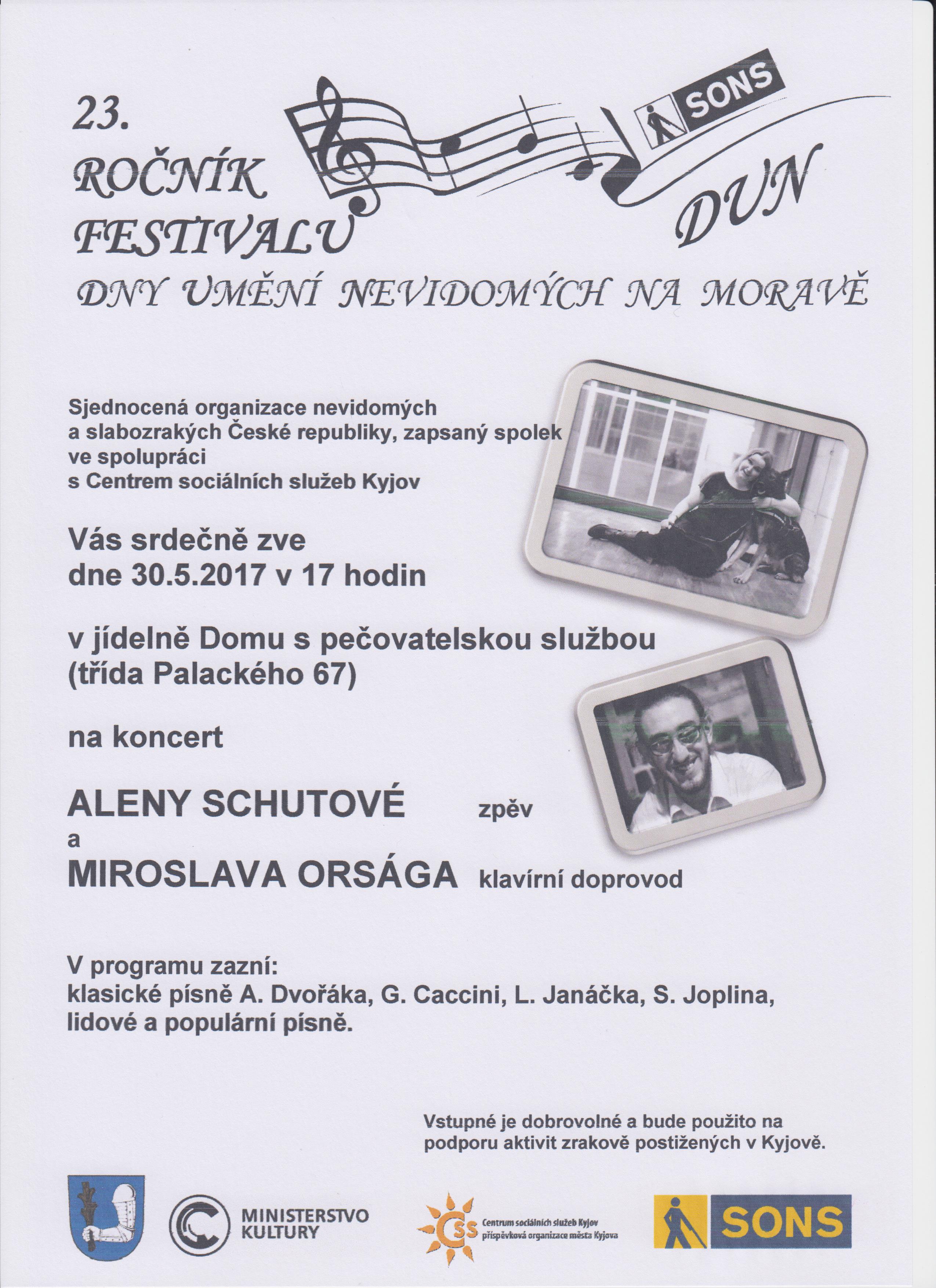 Na 23. ročníku festivalu Dny umění nevidomých na Moravě vystoupí nevidomá zpěvačka Alena Schutová za klavírního doprovodu zrakově postiženého Miroslava Orsága, obá umělci jsou absolventy Konzervatoře J. Deyla v Praze.