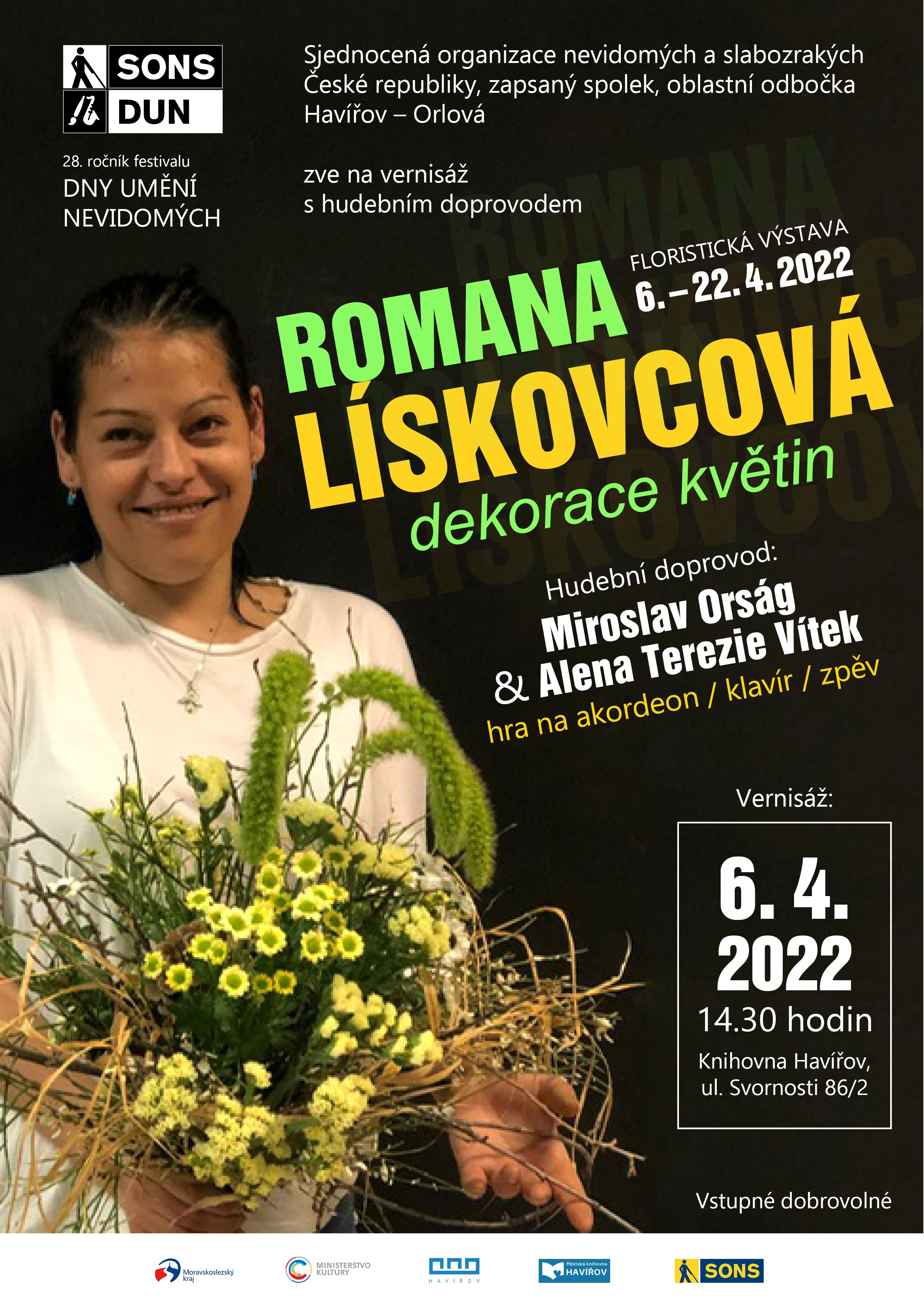 dovolte, abychom Vás pozvali na Vernisáž floristické výstavy s hudebním doprovodem a zpěvem. Tentokrát za námi zavítá slečna Romana Lískovcová, která bude mít neobvyklou výstavu krásných dekorací z květin (které budou nachystané i k zakoupení) a poprvé bude tato akce v doprovodu hudby a zpěvu. Na klavír a okardon nám zahraje Miroslav Orság a zazpívá Alena Terezie Vítek. Těšíme se na vás.