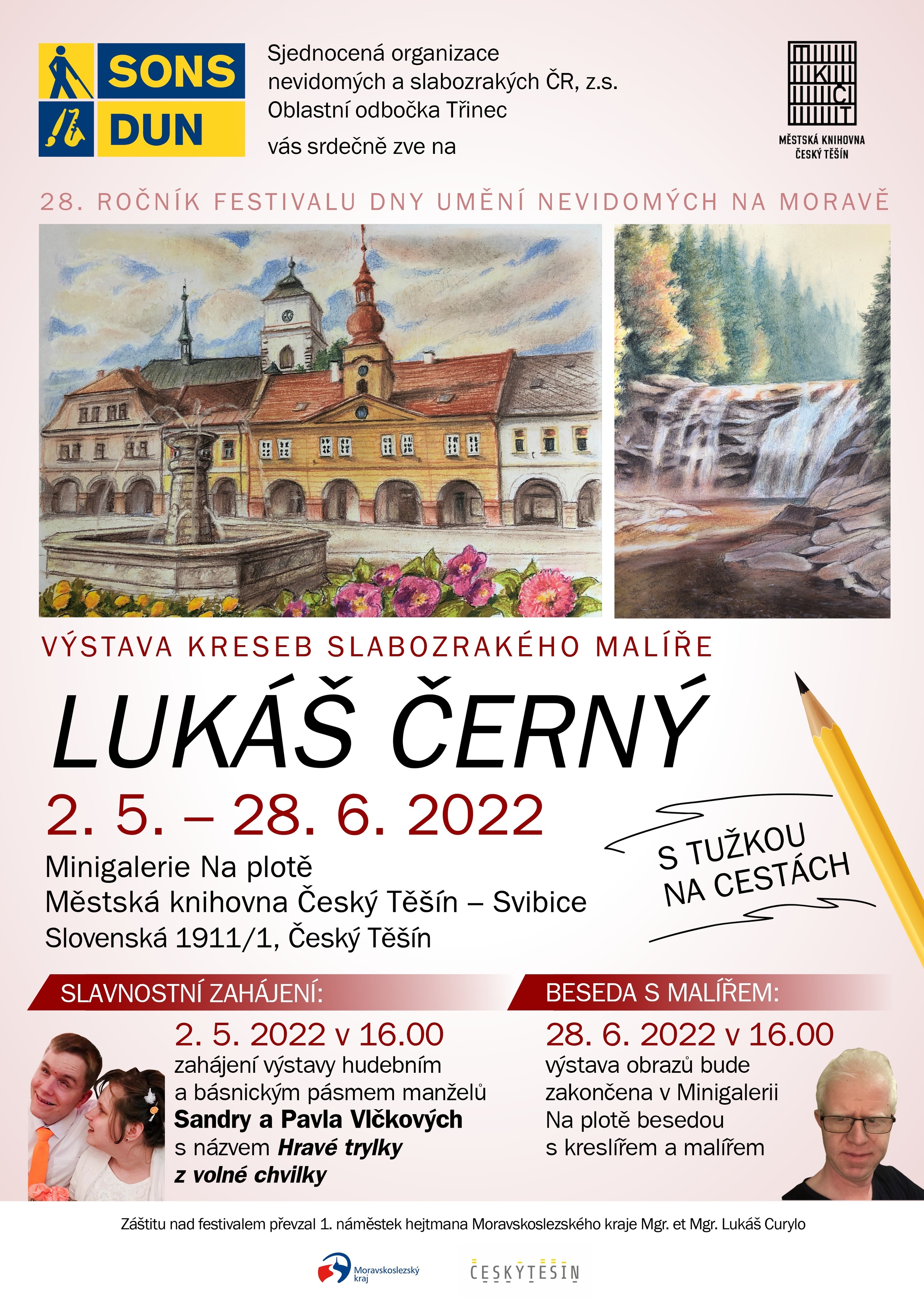 Zveme Vás na výstavu slabozrakého malíře Lukáše Černého s názvem "S tužkou na cestách". Slavnostní zahájení bude v pondělí 2. 5. 2022 od 16 hodin hudebním a básnickém pásmem manželů Sandry a Pavla Vlčkových s názvem Hravé trylky z volné chvilky.