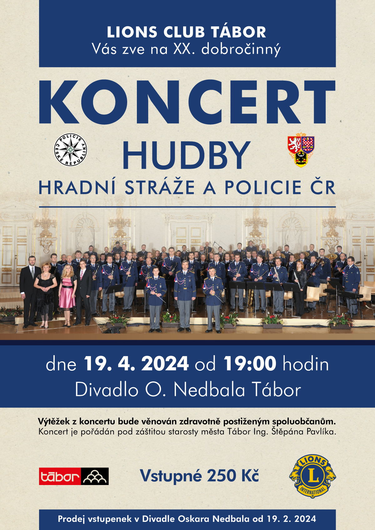 zveme Vás na 20. dobročinný koncert Lions Clubu Tábor, který se koná dne 19. 4. 2024 od 19.00 ve velkém sále Divadla O. Nedbala v Táboře. Na koncertě vystoupí Hudba Hradní stráže a Policie České republiky. Lions club Tábor je dlouholetým podporovatelem naší táborské odbočky a stále nám zachovává přízeň a víru v naše služby.