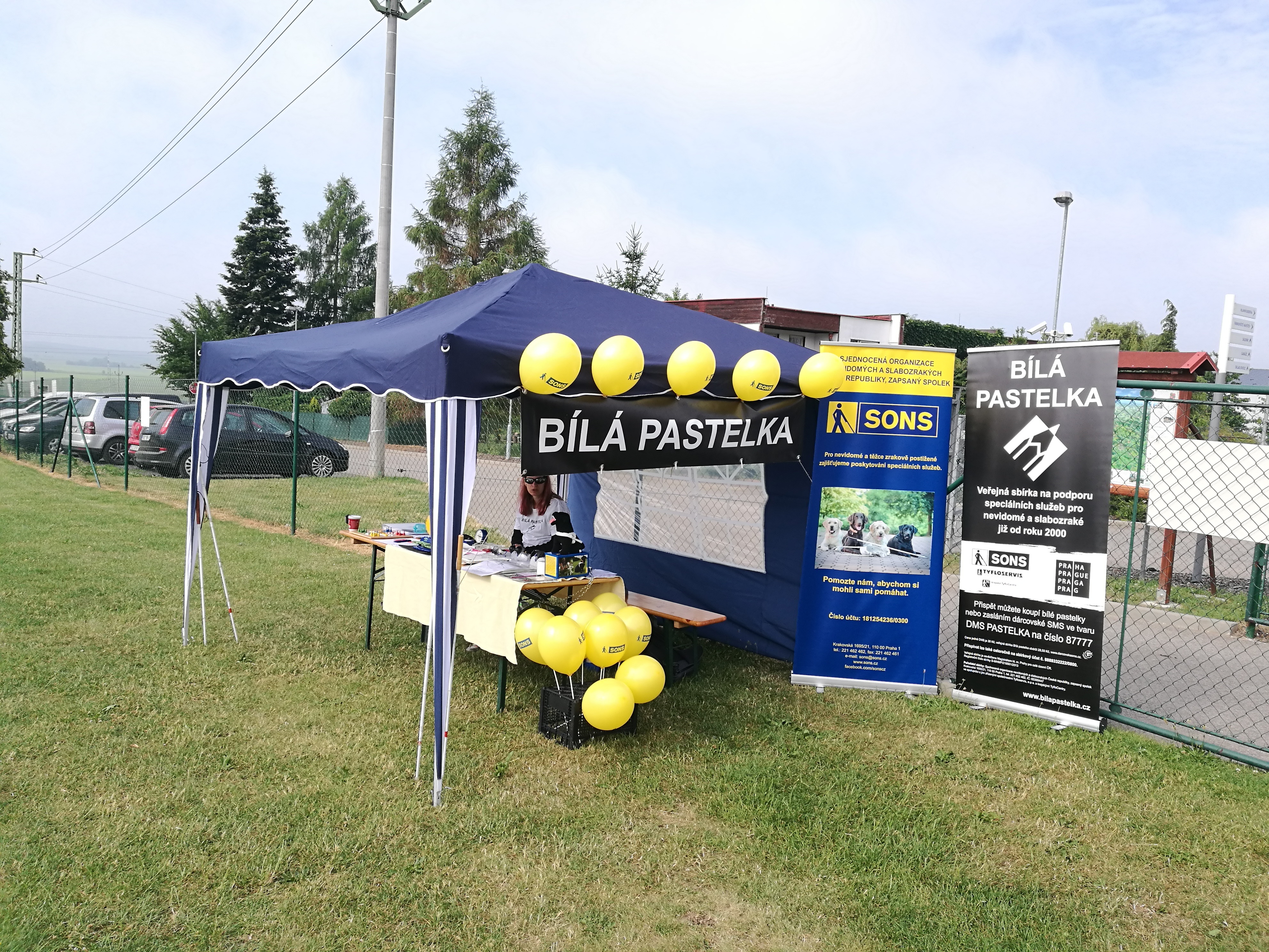 Nabídku jsme rádi vyslyšeli a v 8 hodin ráno již náš stánek stál na místě. Byly připraveny obálky se slovíčky v Braillu, určené k luštění, tentokrát na psí téma a další potřebné pomůcky.