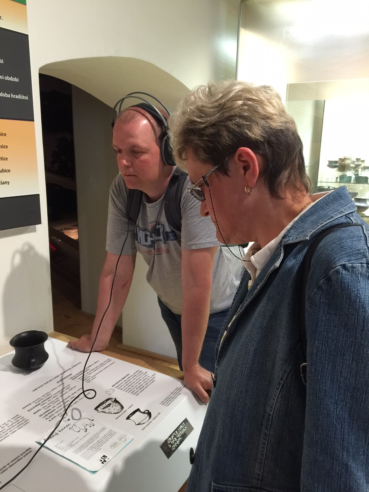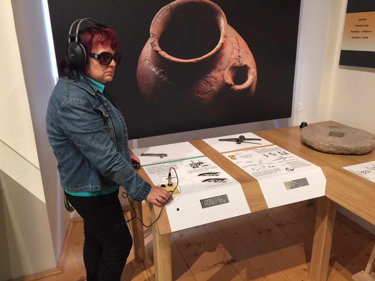 i s minimem odborných termínů. Též jsou zde u exponátů k dispozici obrázky s textem ve zvětšeném černotisku, který nevidomému nebo prakticky nevidomému, či těžce slabozrakému, může přečíst jeho osobní průvodce, anebo pracovník muzea. Nejpodstatnější však je, že jsou zde exponáty, resp. věrné repliky artefaktů, které si může zrakově handicapovaný návštěvník vzít do ruky a ohmatat - „prohlédnout rukama“ !