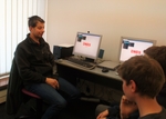 Ve své kanceláři dětem předváděl náš lektor Jirka Sedláček speciální ICT pro zrakově postižené - ozvučený počítač, mobilní telefon i tablet.