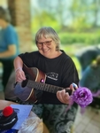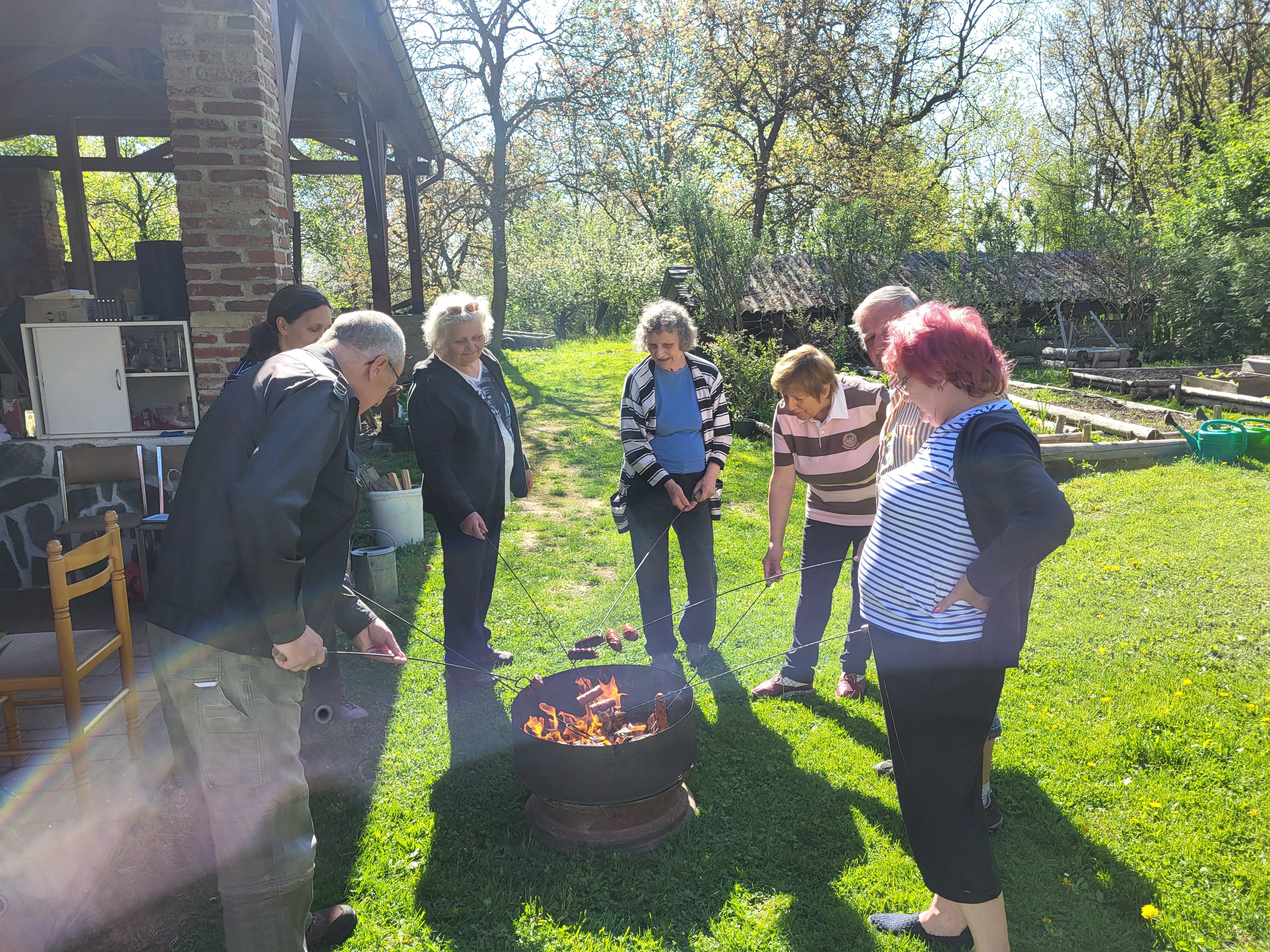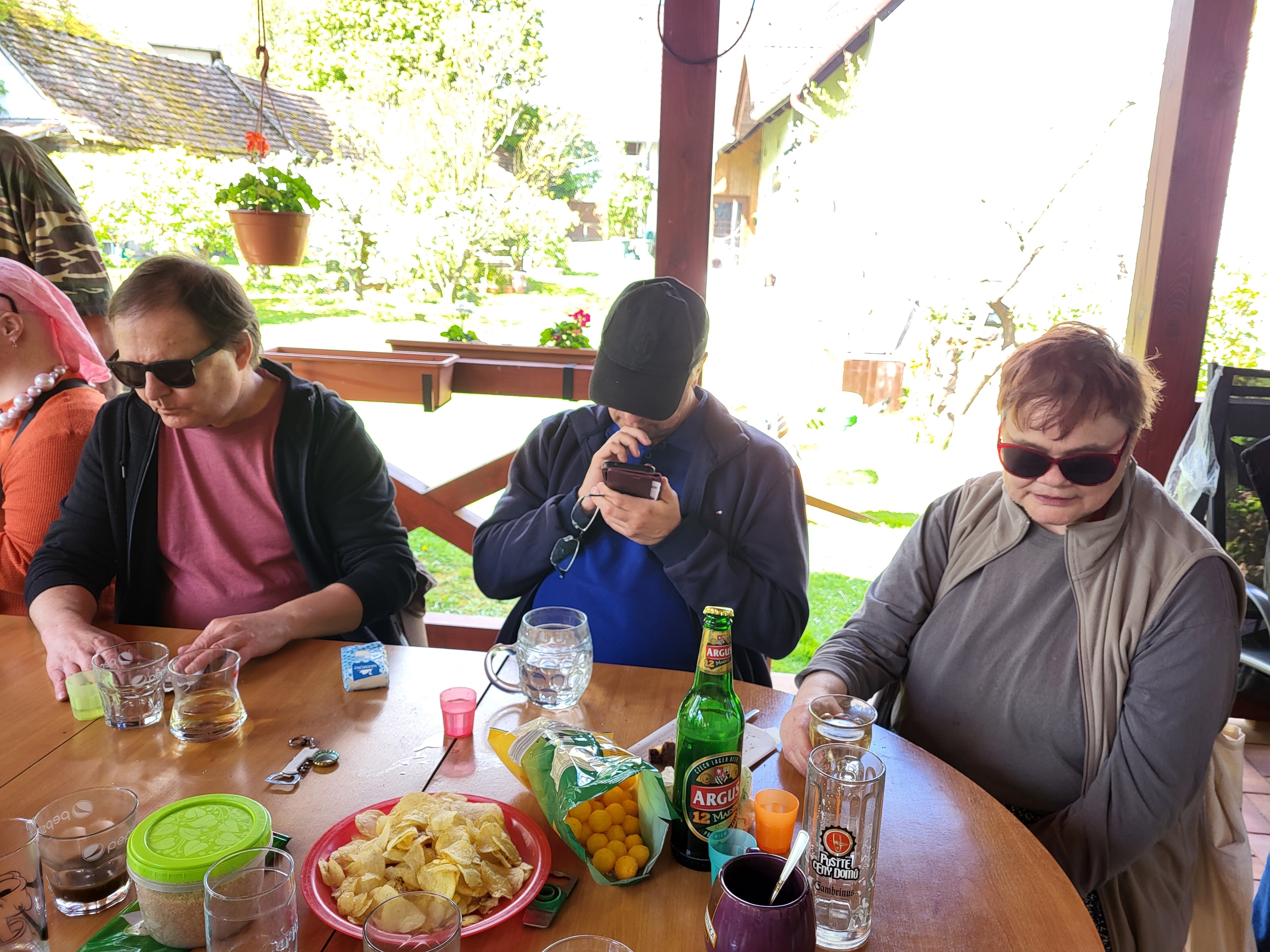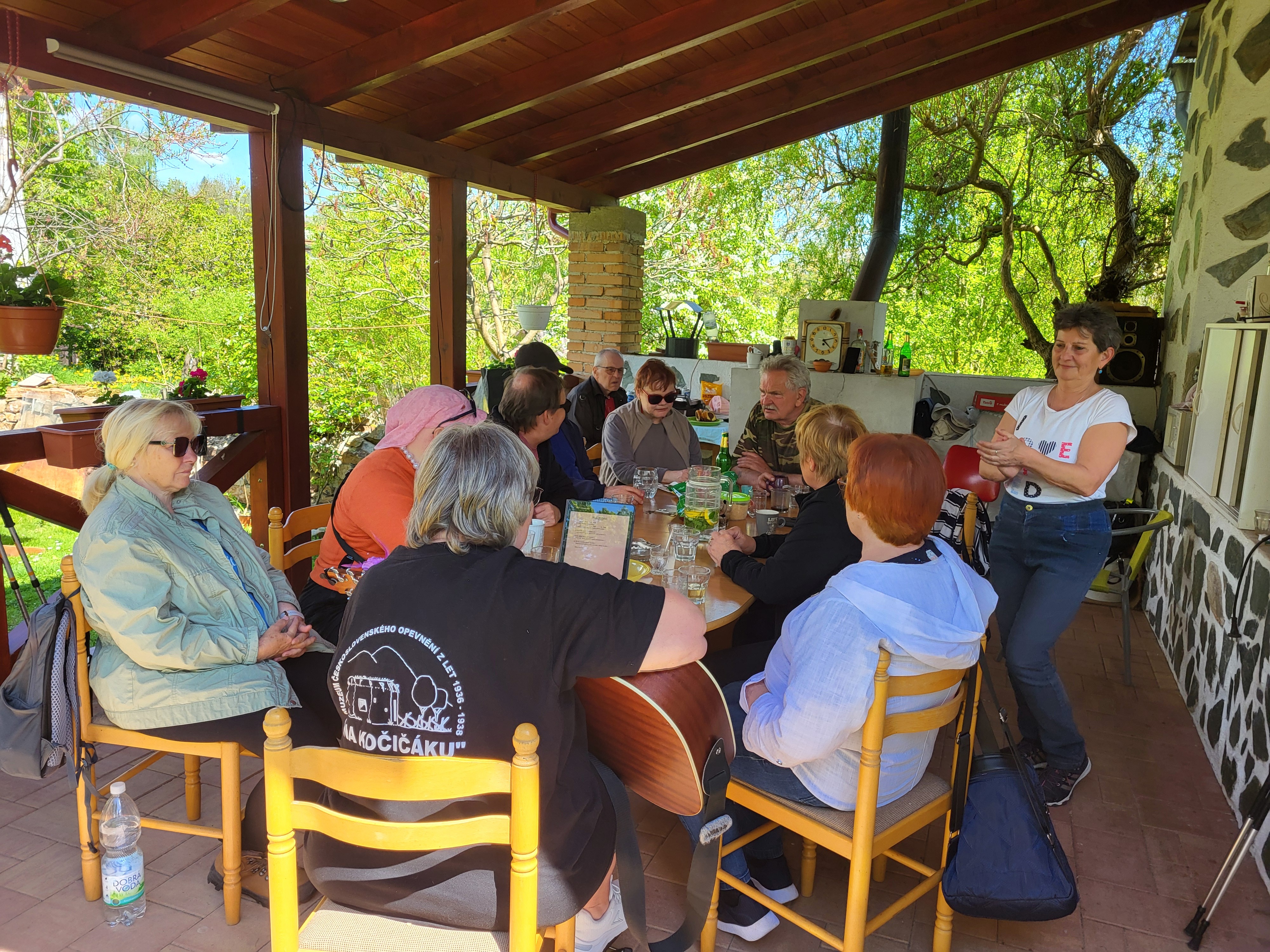 Když jsme opět dostali chuť na něco dobrého, přišlo na řadu sladké – domácí dobroty od Růženky a paní domácí. Vůně čerstvě uvařené kávy se mísila s jarním vzduchem a celkovou pohodu umocnila Miluška, která vytáhla kytaru a doprovodila nás při společném zpívání.