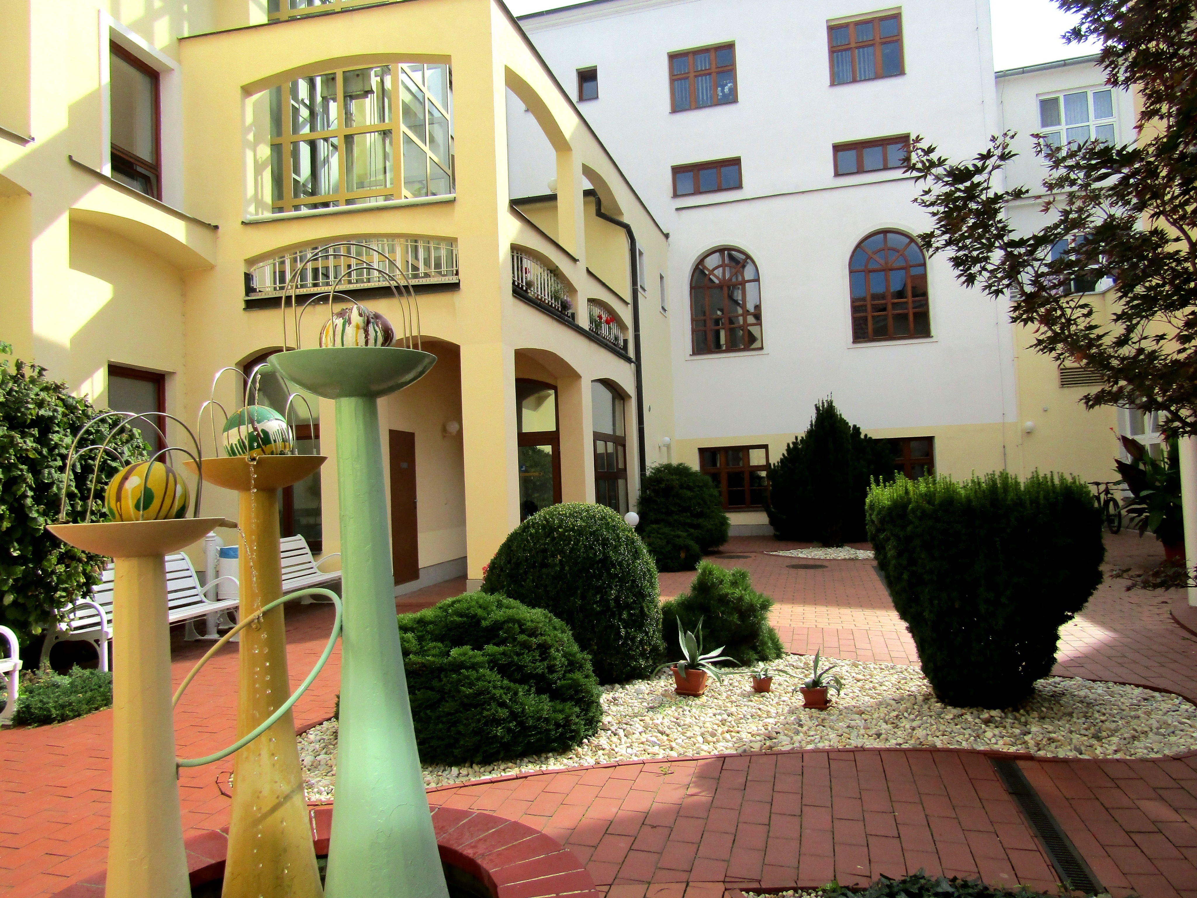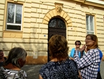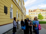 Komentovaná prohlídka začínala právě v átriu Informačního centra, pak prohlídkou budovy radnice, Radniční galerie, která je umístěna v moderní přístavbě dvorního traktu. Za Kulturním domem, kde dříve byla Židovská obec, jsme si mohli detailně prohlédnout Pamětní kámen, s vyobrazením původní kyjovské synagogy. Na náměstí jsme se zastavili u kostela Nanebevzetí Panny Marie a pakračovali ulicí Komenského, kde první zastávkou byla budova bývalé Zdravotnické školy, kterou v roce 1898 postavil kyjovský stavitel Gustav Sonevend a původně zde měla sídlo Odborná škola pro ženská povolání. Kousek dál je kaple svatého Josefa Kalasanského, zvaná také Gymnazijní nebo Piaristická kaple, která sousedí s budovou Klvaňova gymnázia, což je budova přímo naproti našeho sídla. Gymnázium v Kyjově bylo založeno v r. 1898. Jeho prvním ředitelem byl Josef Klvaňa, uznávaný národopisec a přírodovědec. Na štítu budovy jsou 2 pamětní desky: První je pamětní deska Josefa Klvani. Druhá pamětní deska patří Oldřichu Pechalovi, což byl jeden ze studentů gymnázia a velitel československé zahraniční armády, byl zatčen, mučen a odsouzen k smrti.