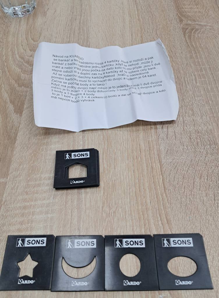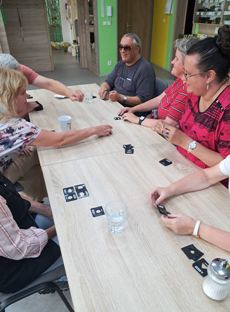 V rámci našeho setkávání jsme jedno odpoledne potrápili mozkové závity a prsty při hře Quardo. Hra je založena na tom, že pomocí hmatání prsty zjisťujete tvar karty, kterou dostanete do ruky a přiřazujete k sobě dvojice. K následným dvojicím jsou pak přiřazeny body a samozřejmě vyhrává ten, který má bodů nejvíce.