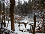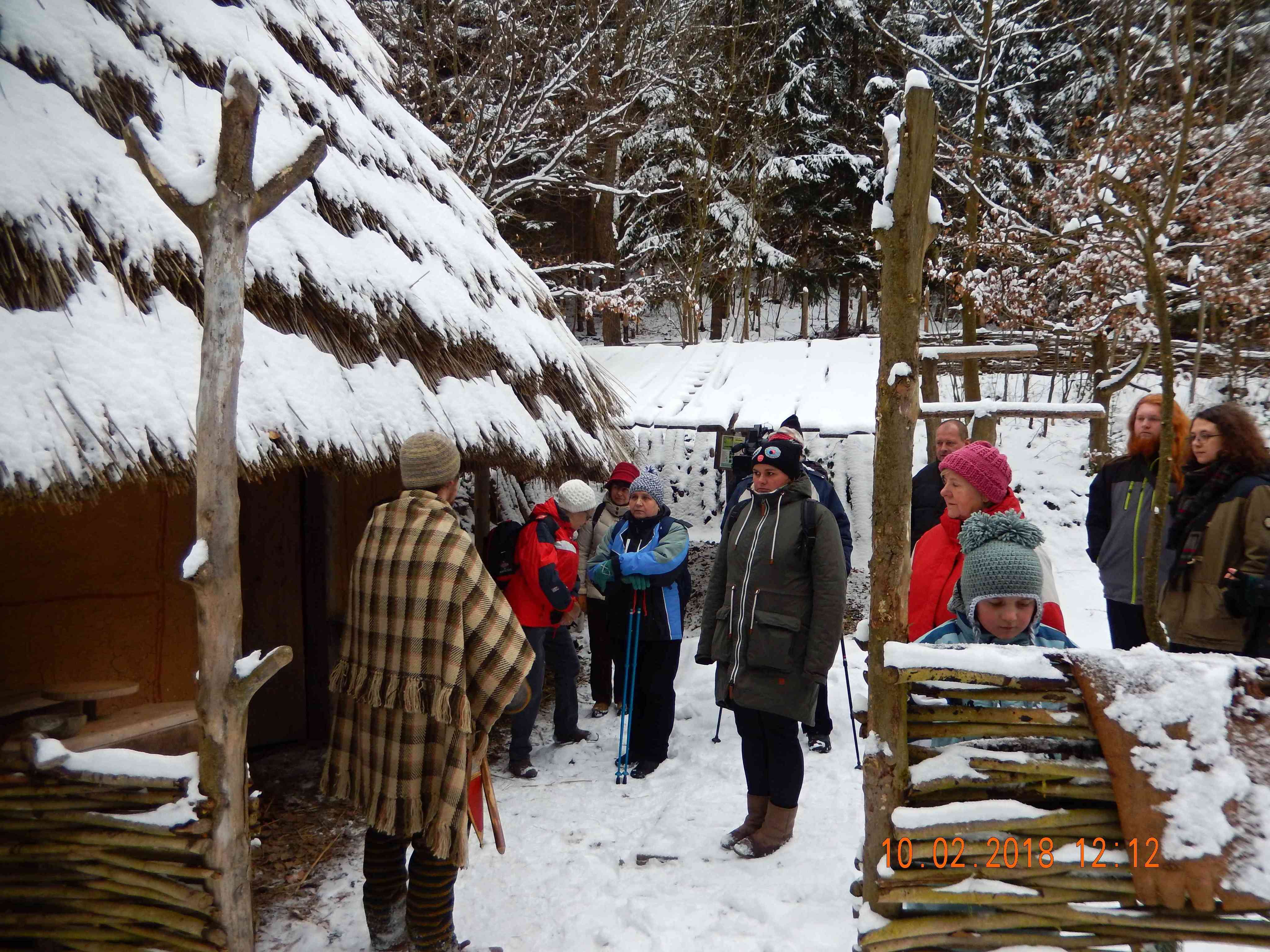 Turistická značka za městem odbočuje do lesa a pozvolna stoupá proti toku potoka údolím Křivolíku. Byl sníh, a tak procházka zasněženou krajinou vytvářela neopakovatelnou atmosféru. Cestou, nás předjelo auto České televize, asi to bude v Toulavé kameře – zaznělo. Po, zhruba třech kilometrech jsme došli k prvnímu cíli, a to k Pravěké osadě. Přidali jsme se ke skupince, která již v osadě byla, a začali naslouchat: