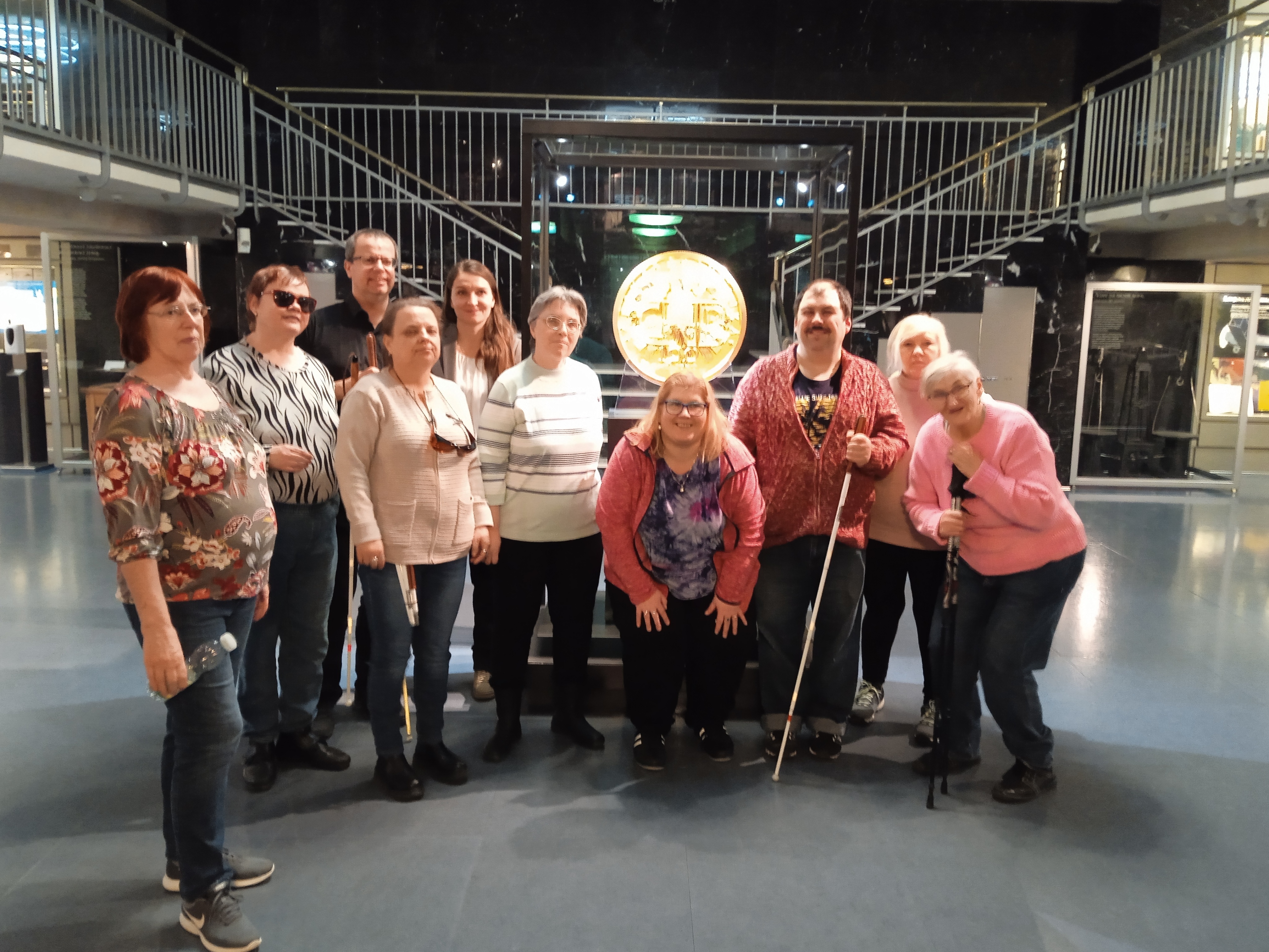 Po shlédnutí krátkého filmu jsme se přesunuli ke stolu, kde na nás čekal 3D model půdorysu banky a další hmatové zážitky včetně braillských popisků a to v českém i anglickém jazyce. Zde Emilka poučila paní průvodkyni o správné použití šablony na rozeznávání bankovek, a k čemu v šablonce slouží obdélníkový otvor a Laďka předala pracovnicím své ručně dělané záložky. Pak jsme po schodech či výtahem sestoupili do podzemí, kde nachází se nedobytný trezor. Jeho dveře váží 8 tun a i s rámem váží celá konstrukce 36 tun. Prý nebyl zatím nikdy vykraden a ani my jsme si odsud nic neodnesli. Ono také strčte si do kapsy druhou největší zlatou minci světa, která váží 180 kg a na šířku měří něco kolem jednoho metru. Na chvilenku jsme se též zastavili u bezpečnostních schránek, které kdysi využívali majetnější klienti Živnostenské banky. Ano píši Živnostenská banka, protože budova současné národní banky patřila kdysi Živnostenské bance.