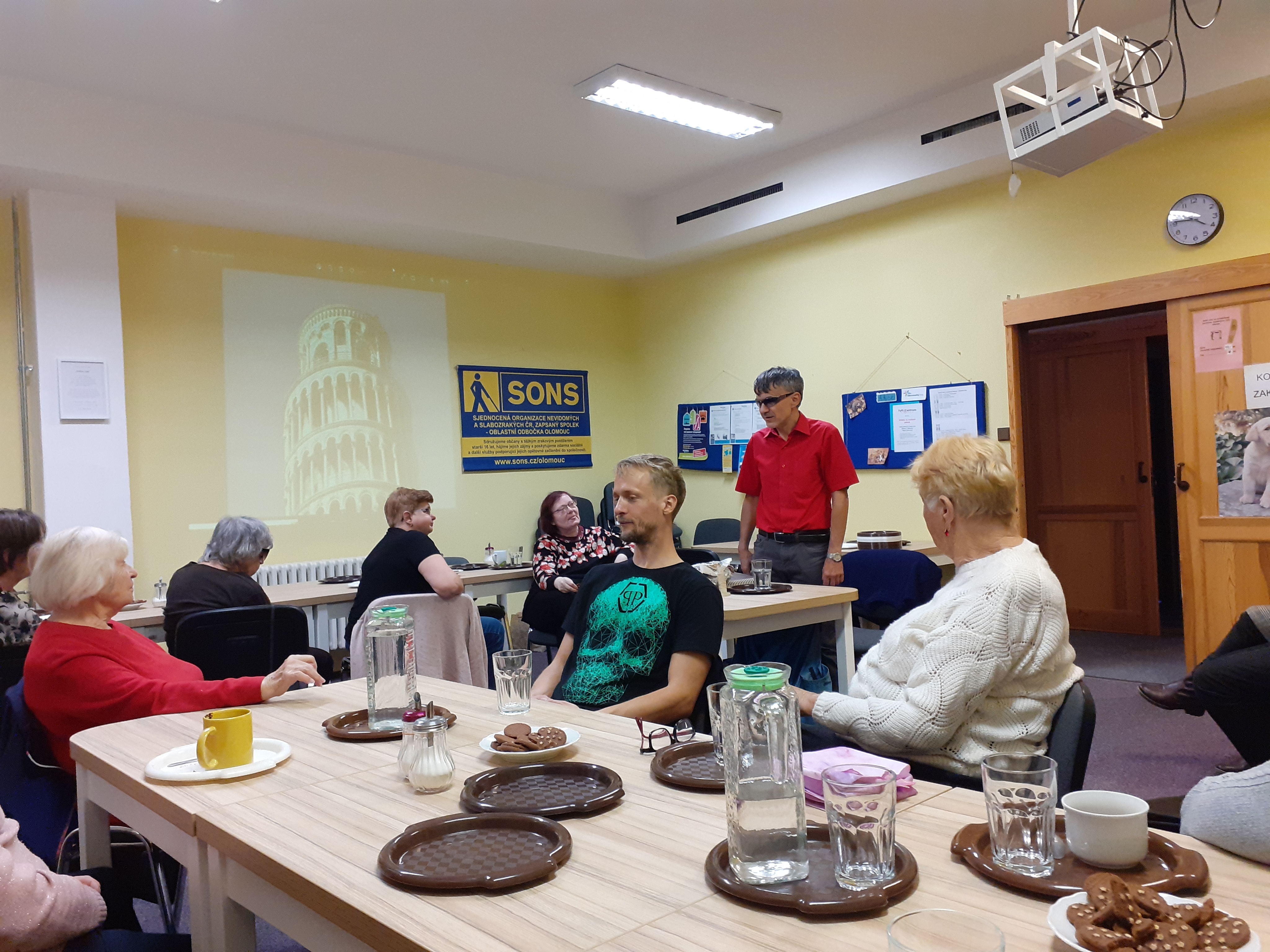 A tak se i stalo, protože sluch jsme zapojili díky poslechu slov pana Kvida a audionahrávek, zrak díky promítání obrázků (někteří z účastníků obrázky sice nemohli zhlédnout i očima, ale byly doplněny náležitým slovním popisem), čich a chuť díky nabídnutým italským dobrotám a hmat díky haptickým modelům (např. šikmá věž v Pise). To však zdaleka nebylo všechno - zapojili jsme i paměť (na začátku setkání posluchači mohli ostatním povědět, jestli a kde v Itálii už byli), představivost a komunikační dovednosti, protože díky tomu, že jsme spolu mohli být osobně a ne pouze „na dálku“ jsme pokládali zvídavé otázky, na které pan Kvido rád odpovídal a rozvíjel tím další a další témata…
