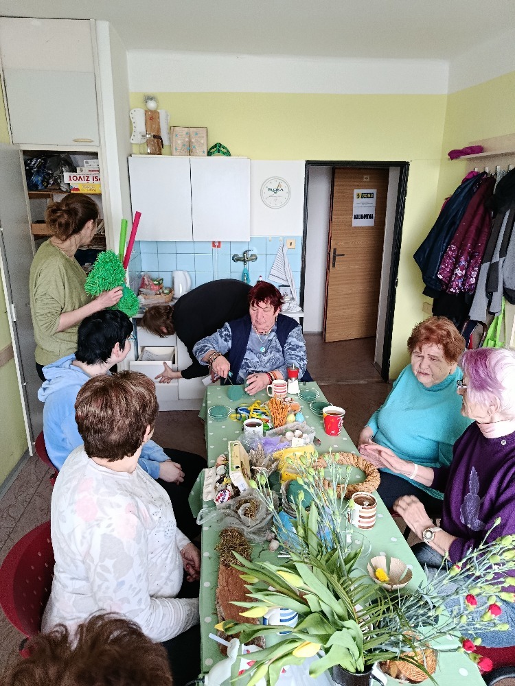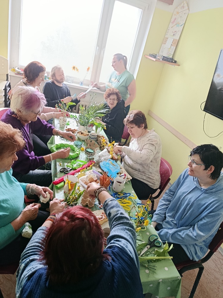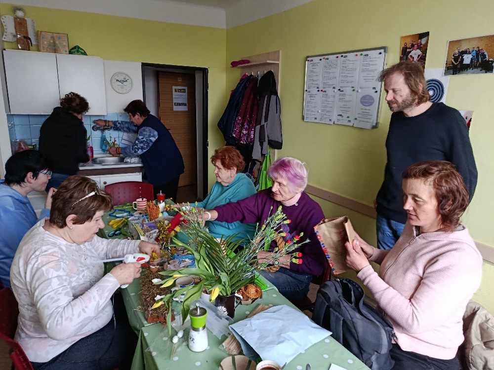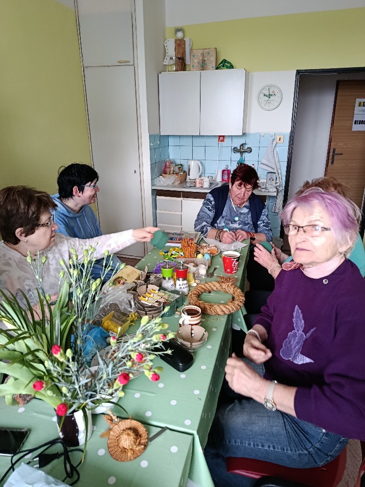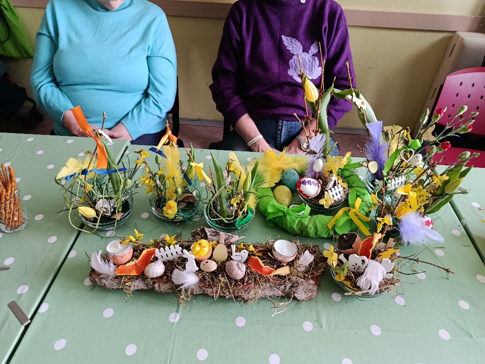 Poslední akcí měsíce března bylo jarní a velikonoční tvoření. Ve čtvrtek 26. března dopoledne jsme se sešli v naší klubovně, abychom se společně těšili na jaro a velikonoční svátky. Ruční tvoření je mezi našimi členkami velice oblíbené, příjemně se u něj odreagujeme, popovídáme si u kávy a tvoříme tématická dílka dle našich představ. Tentokrát jsme měli připravené malé skleněné mističky, aranžovací pěnu a květiny, které jsou symbolem jara. Společně s nejrůznějšími velikonočními dekoracemi a drobnostmi, které jsme již v klubovně měli, vytvořily naše členky skutečně krásná velikonoční dílka. Mnohé z nich donesly i vlastní větvičky či kůru, abychom měli k dispozici co nejrůznější materiály. Někdo si své výtvory odnesl domů, jiní nám je v klubovně nechali na výzdobu. Z tvoření jsme všichni odcházeli pozitivně a jarně naladěni. Budeme se těšit, až se zase společně sejdeme u další tvorby.