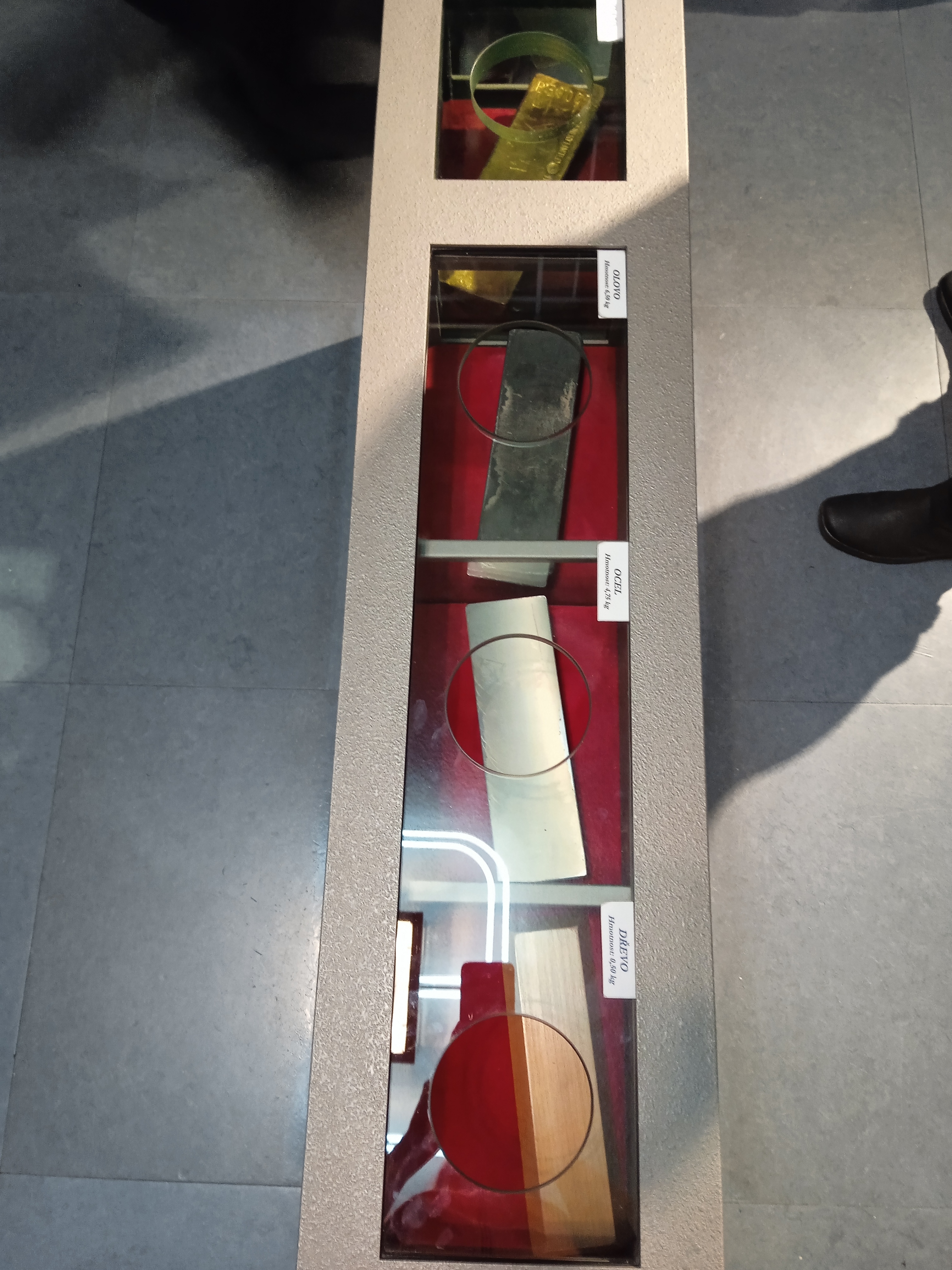 Nakonec jsme zavítali k vitrínám s otvorem pro naši ruku. V prvním otvoru jsme nahmátli cihličku ze dřeva. Lehoučká, jako pírko. Ve druhém otvoru se již po prosunutí ruky objevila cihlička ocelová. Ta už měla pořádnou váhu. Pak následovala cihlička z olova a nakonec cihlička z ryzího zlata.