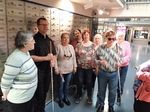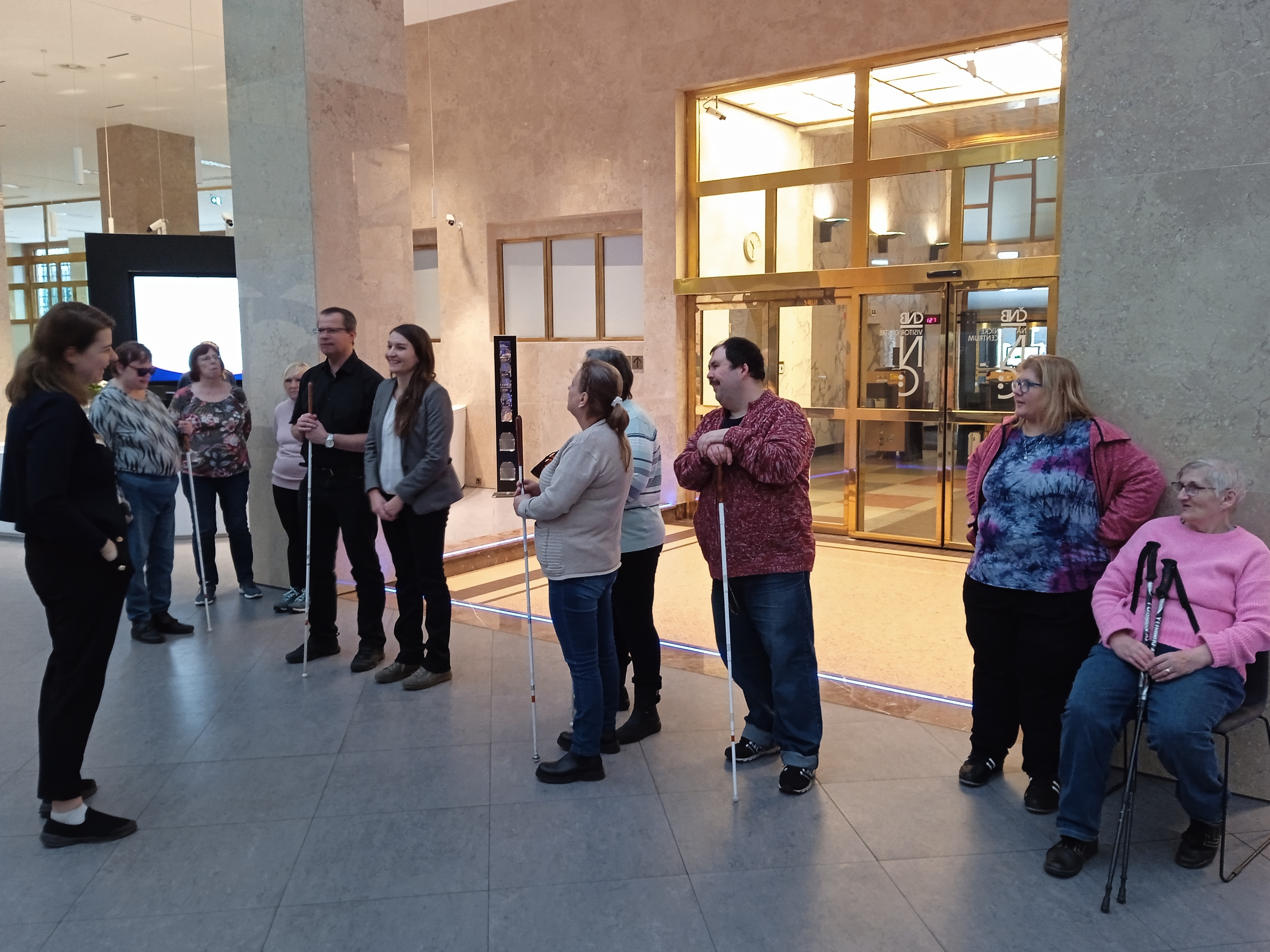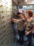 Po shlédnutí krátkého filmu jsme se přesunuli ke stolu, kde na nás čekal 3D model půdorysu banky a další hmatové zážitky včetně braillských popisků a to v českém i anglickém jazyce. Zde Emilka poučila paní průvodkyni o správné použití šablony na rozeznávání bankovek, a k čemu v šablonce slouží obdélníkový otvor a Laďka předala pracovnicím své ručně dělané záložky. Pak jsme po schodech či výtahem sestoupili do podzemí, kde nachází se nedobytný trezor. Jeho dveře váží 8 tun a i s rámem váží celá konstrukce 36 tun. Prý nebyl zatím nikdy vykraden a ani my jsme si odsud nic neodnesli. Ono také strčte si do kapsy druhou největší zlatou minci světa, která váží 180 kg a na šířku měří něco kolem jednoho metru. Na chvilenku jsme se též zastavili u bezpečnostních schránek, které kdysi využívali majetnější klienti Živnostenské banky. Ano píši Živnostenská banka, protože budova současné národní banky patřila kdysi Živnostenské bance.