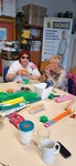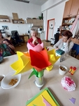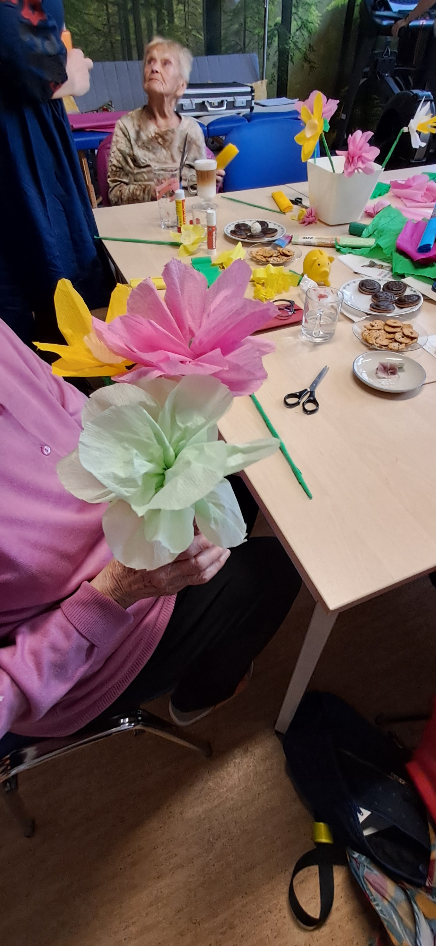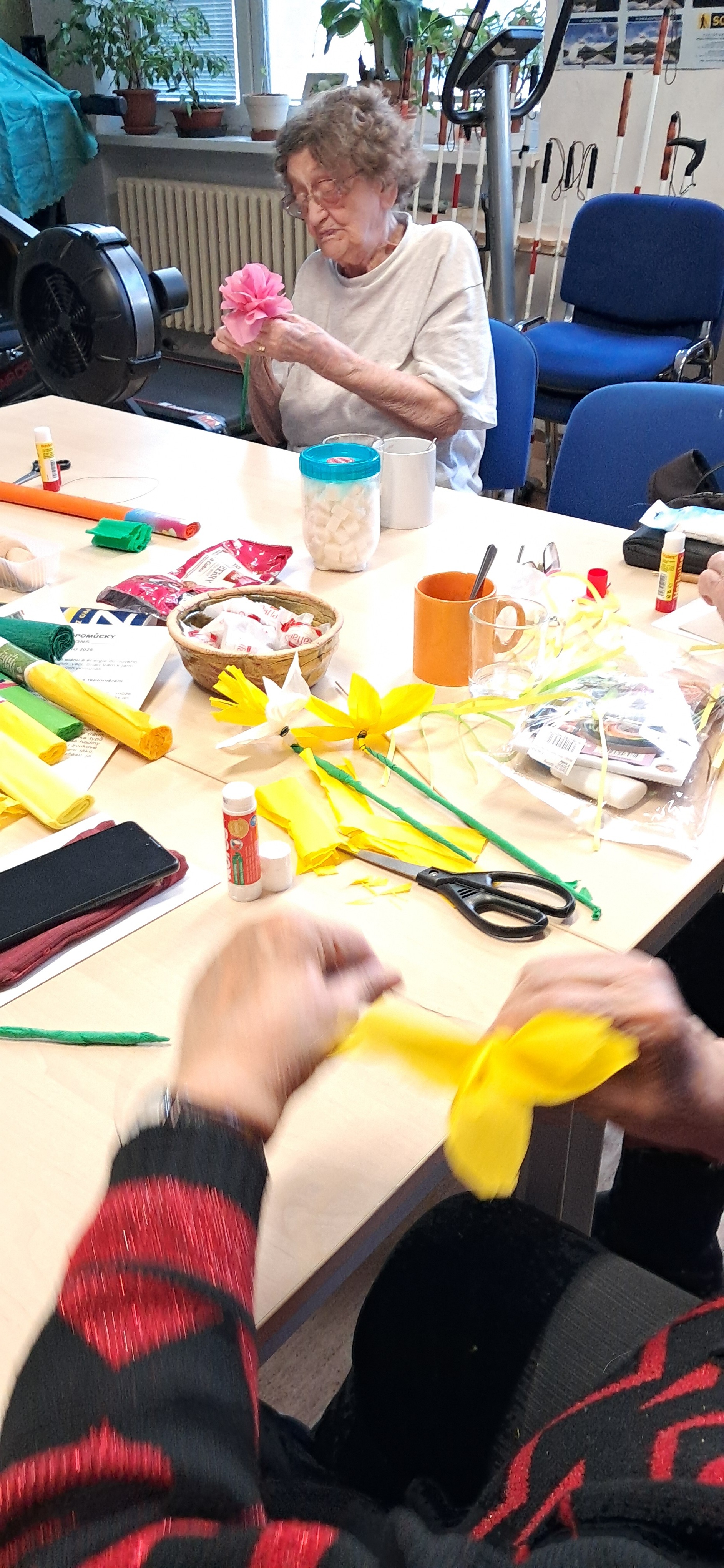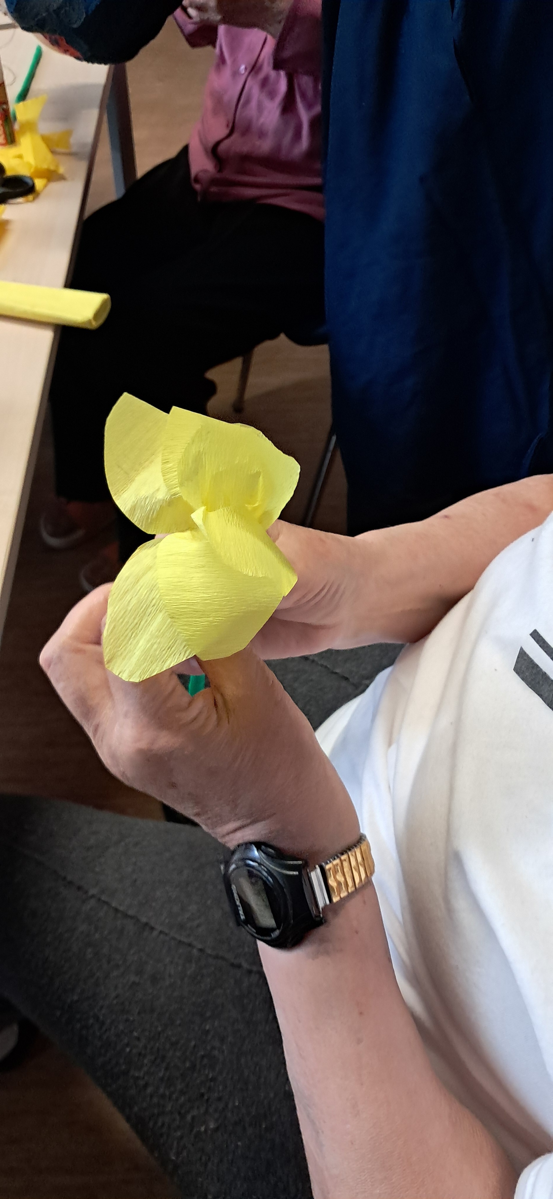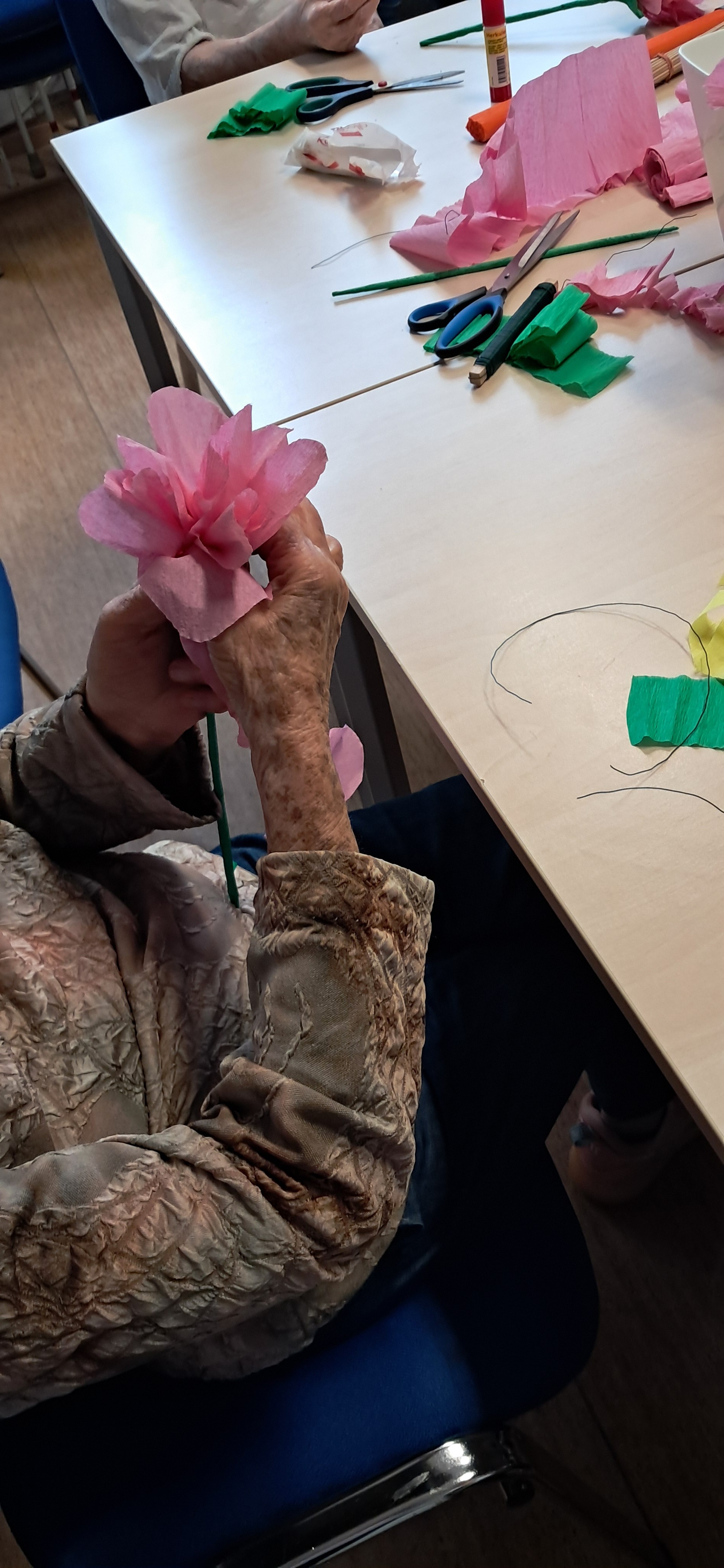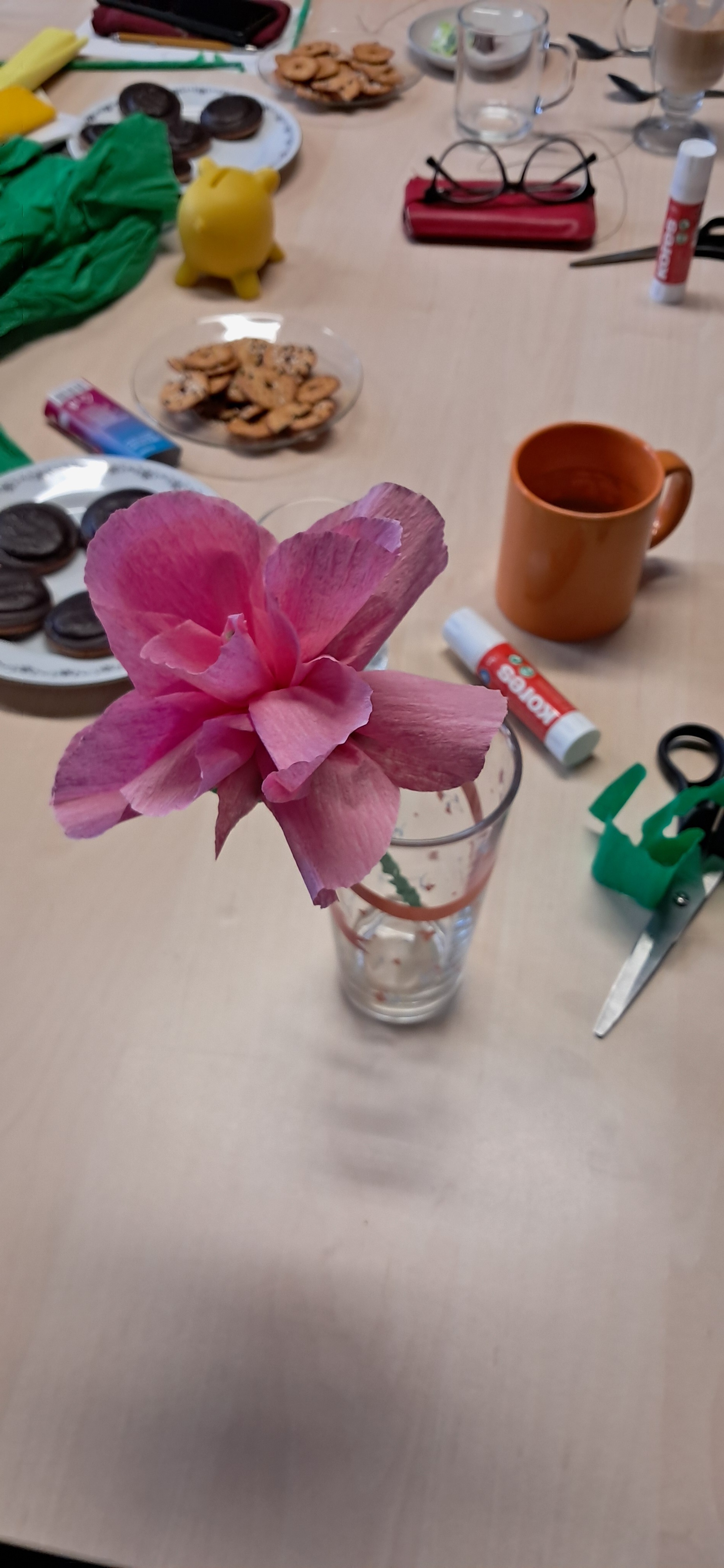 Použili jsme špejle na stonek. Ten se obalil krepovým papírem. Květy se pak motaly ručně a s pomocí lepidla spojily.
