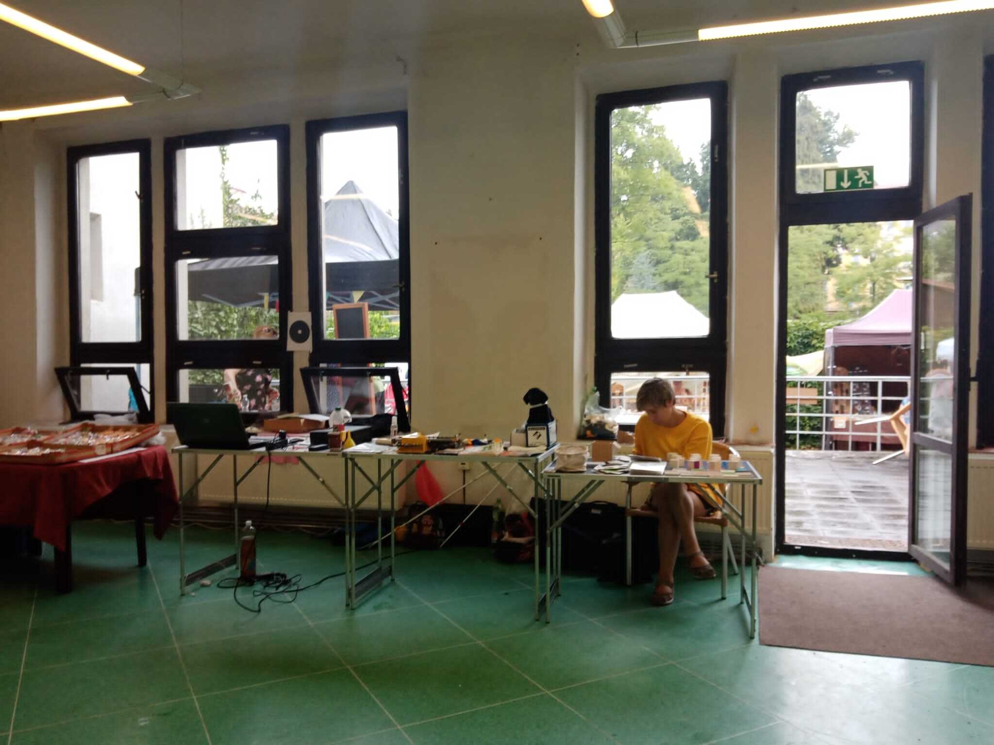 Poslední srpnovou sobotu - 25. srpna - se konal jarmark v knihovně Jičíně. Před 9. hodinou jsme vybalili všechny své pomůcky na dvoře Knihovny. Ovšem tušili jsme, že venku moc dlouho nevydržíme. Během 15 minut začalo pršet a my jsme byli nuceni přesunout se přímo do vnitřních prostor knihovny. I přes tento nepříjemný začátek jsme byli odhodlaní, že si nenecháme zkazit náladu špatným počasím a nadšeně jsme se pustili do ukázek.