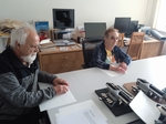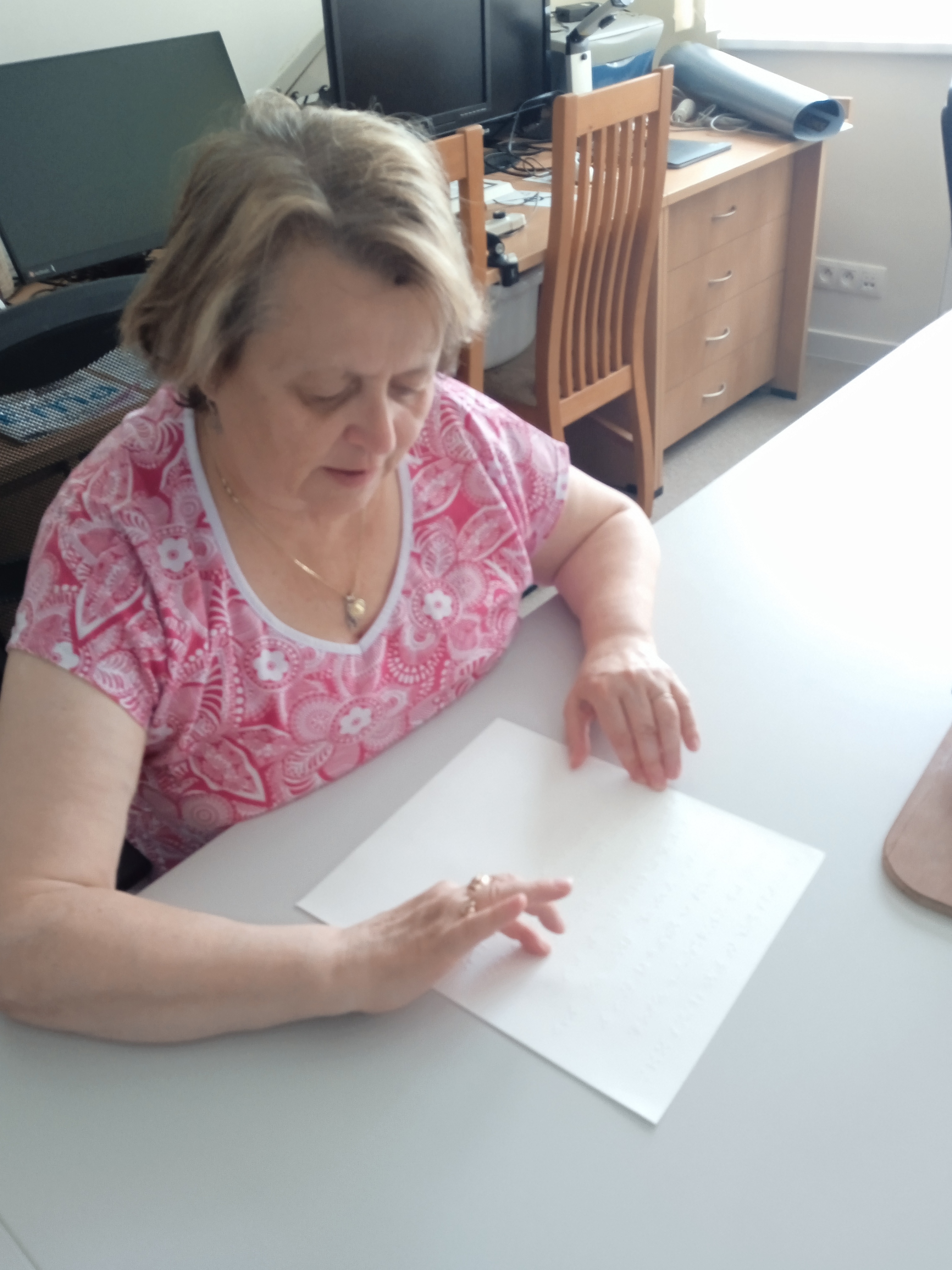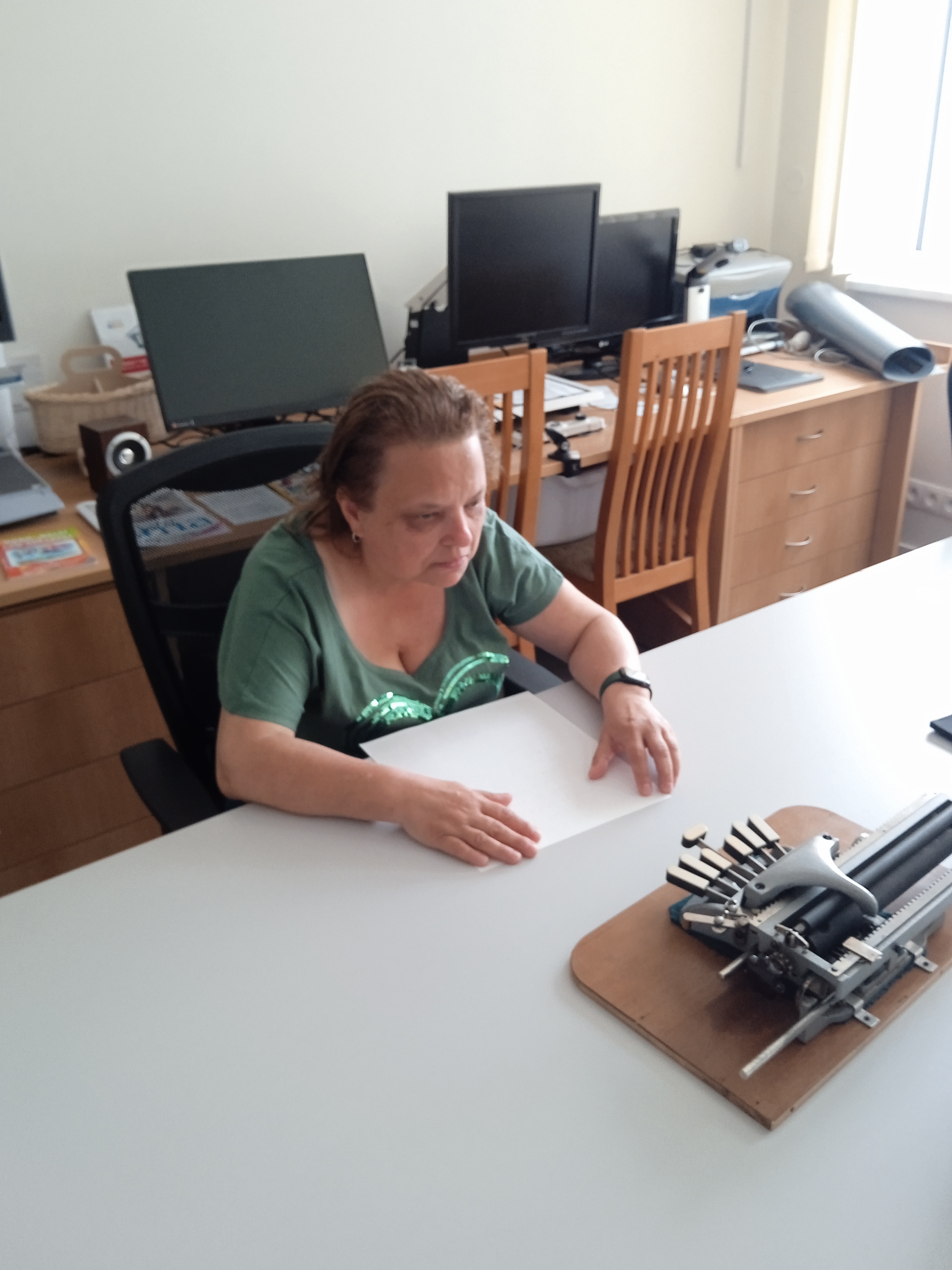 Poté co jsme se občerstvili a seznámili s Jiřinkou (vedoucí odbočky v Českém Krumlově), se naši porotci a rozhodčí odebrali do zadní kanceláře, kde máme pomůcky, a po jednom si každého z nás zvali k sobě. Nejdříve šly závodnice píšící prostřednictvím tzv. pražské tabulky. Během dvou minut měly za úkol napsat, co nejdelší text. Pan A. Vraný sledoval časomíru za pomocí BlindShell, Hanka diktovala a pan J. Reichl pak zkontroloval správnost zápisu. Stejným způsobem se postupovali i při psaní na Pichtově psacím stroji. Jako třetí disciplína následovalo čtení textu v bodovém písmu na čas. Opět jsme měli dvě minuty a pan J. Reichel opět kontroloval správnost čteného textu, přičemž za každé správně přečtené slovo jsme obdrželi jeden bod a za každé špatně přečtené jsme bod ztratili. Jako poslední disciplína nás čekalo psaní na klávesnici QWERTY. Zde už se nepočítala slova, ale znaky, stejně, jako u Pichtova stroje. A časový limit byl opět nastaven na 120 sekund nebo-li dvě minuty.