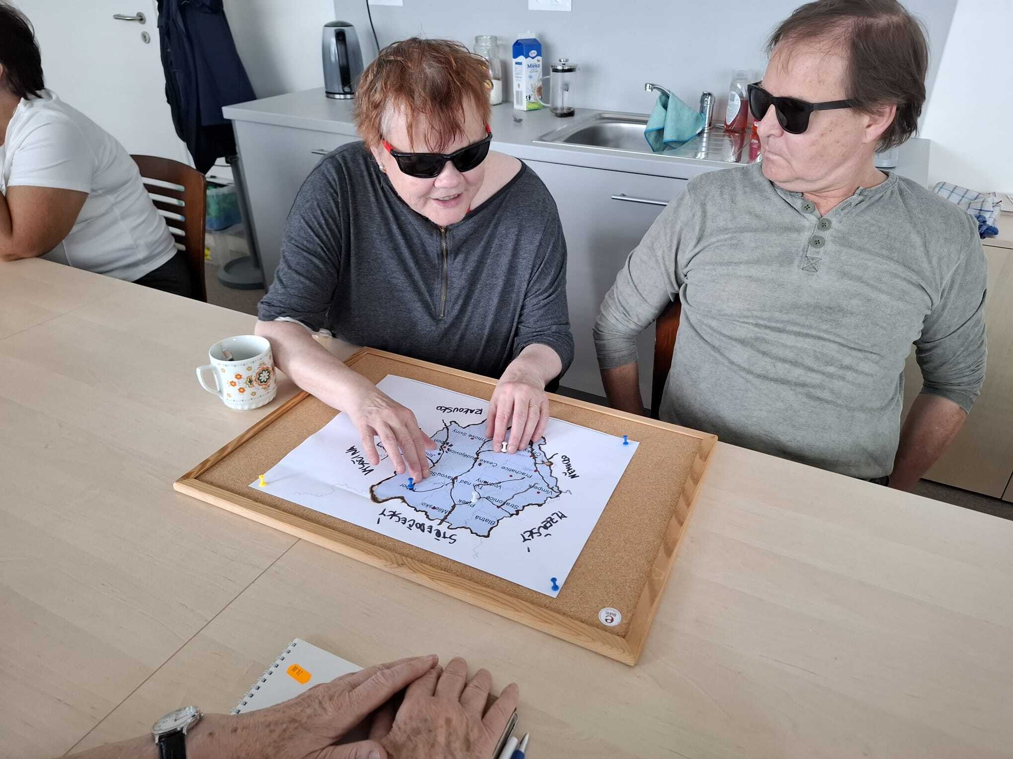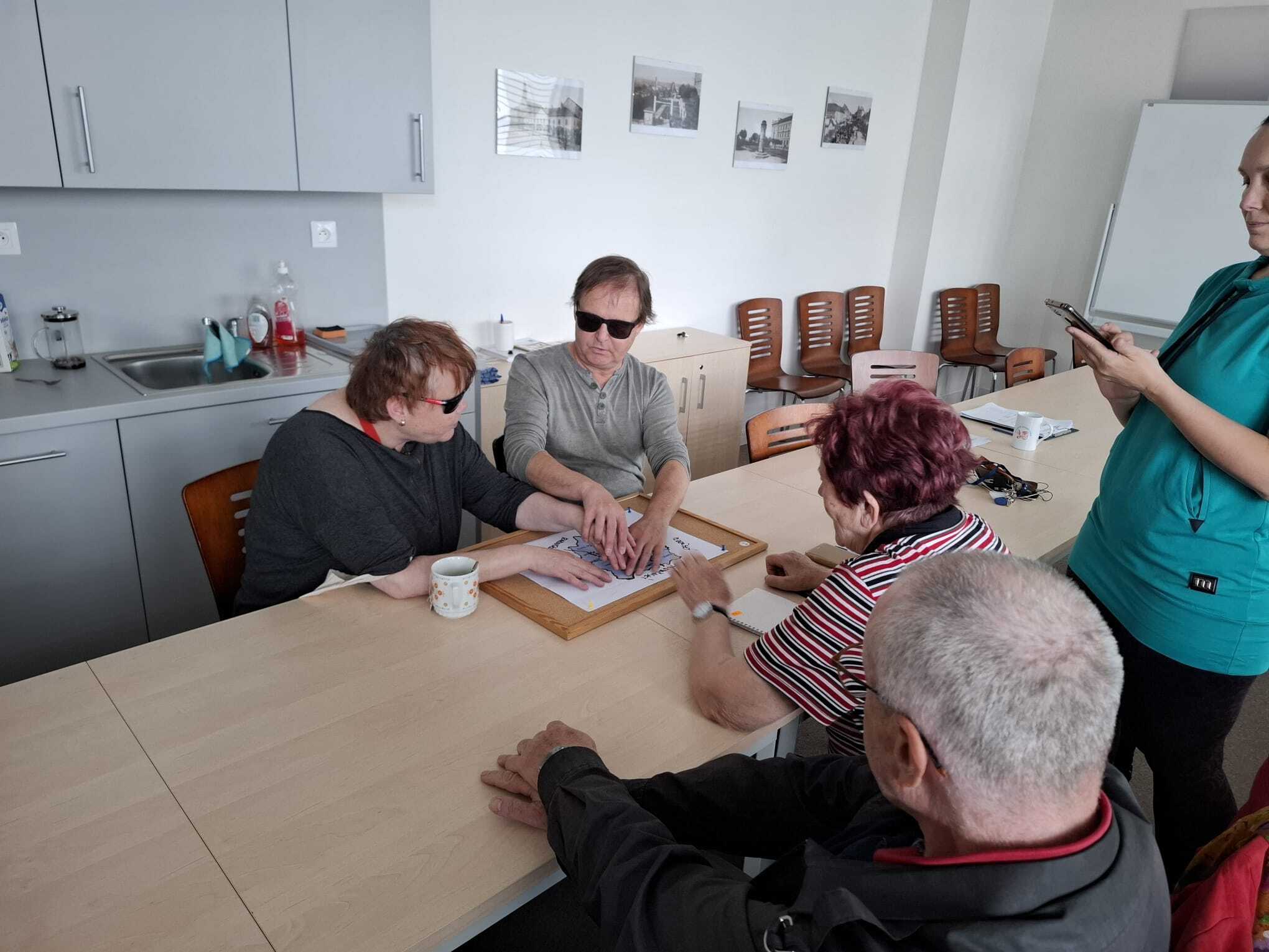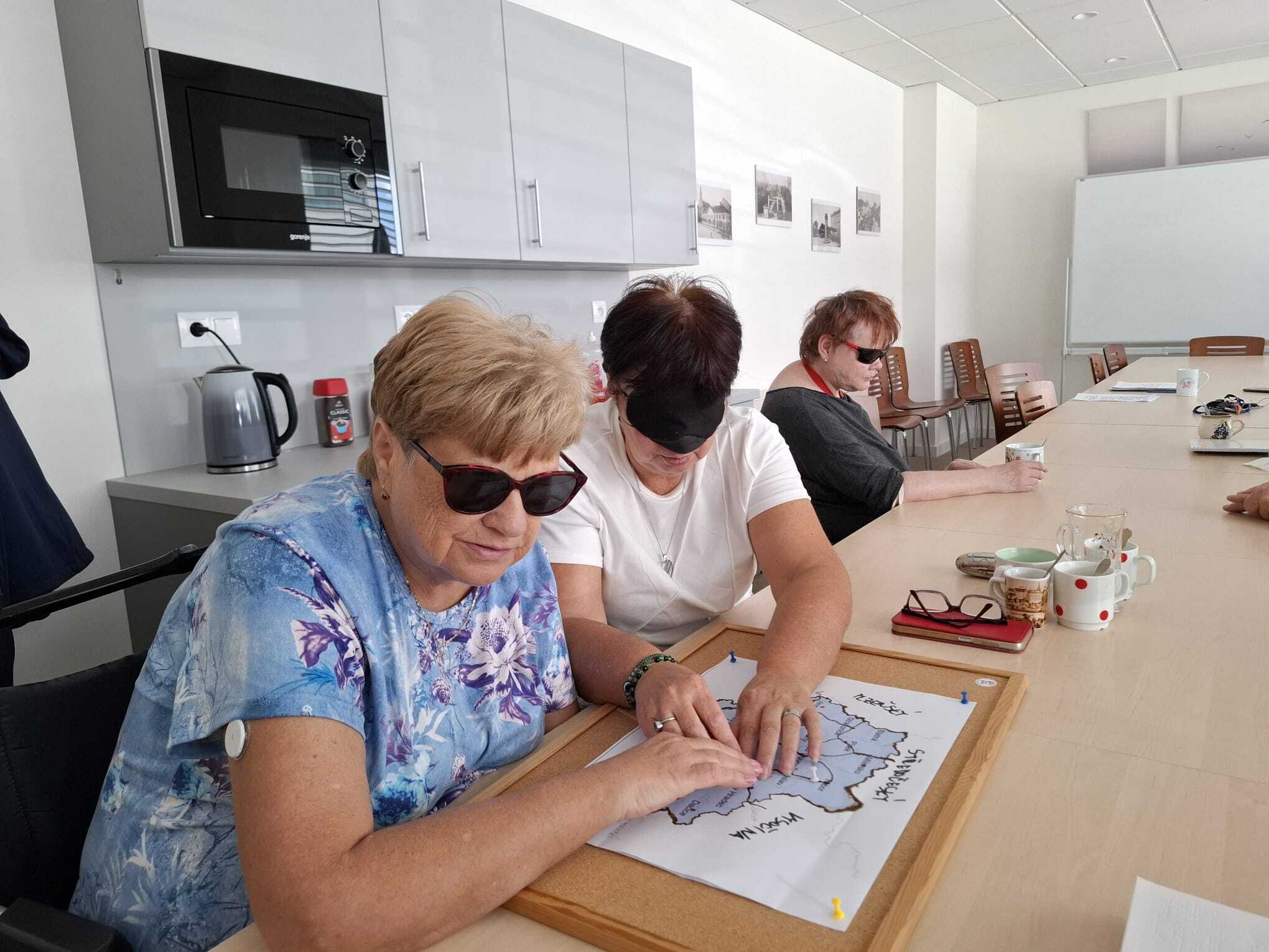 Pracovníci si pro nás připravili pestrý program, ve kterém nechyběly zajímavosti o kraji, soutěže ani haptická mapka. Ta je speciálně upravená tak, aby se v ní dalo orientovat hmatem – jednotlivé řeky, vodní plochy i vybraná města byly plasticky zvýrazněny. Pro naše nevidomé účastníky šlo o cennou pomůcku, ale i pro vidící to byla zábavná výzva.