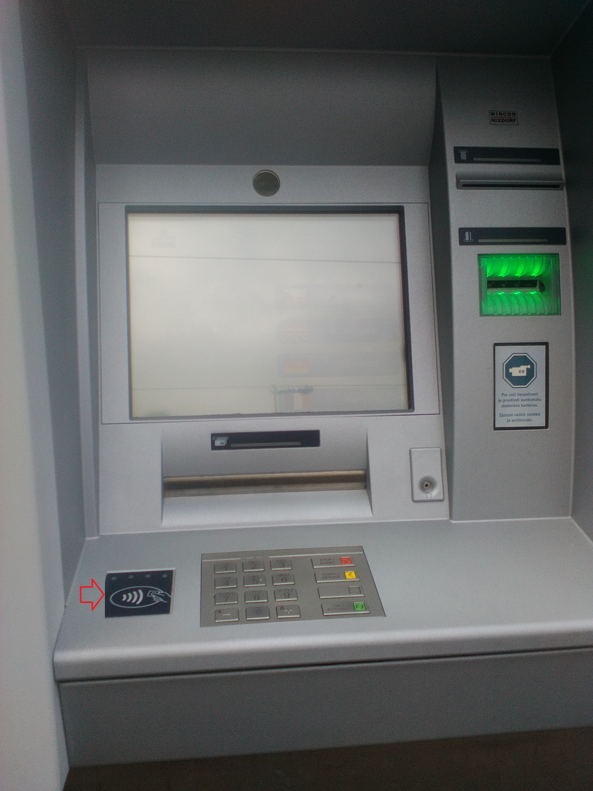 Jakmile klient aktivuje aplikaci pro nevidomé vložením konektoru sluchátka do zdířky bankomatu, je vyzván k vložení karty. Pokud je bankomat bezkontaktní, stačí kartu přiložit. Bankomat ale sám neupozorní, že má bezkontaktní čtečku. Čtečky jsou na bankomatech ČSOB různé a i různě umístěné (příklad vyznačen na foto) i navigace ohledně přiložení karty by musela být řešena u každého bankomatu individuálně. Průběh transakce je stejný. Pozor, pro bezkontaktní použití karty má bankomat v závěru transakce totožnou frázi jako u transakce vkládáním karty:"odeberte kartu".