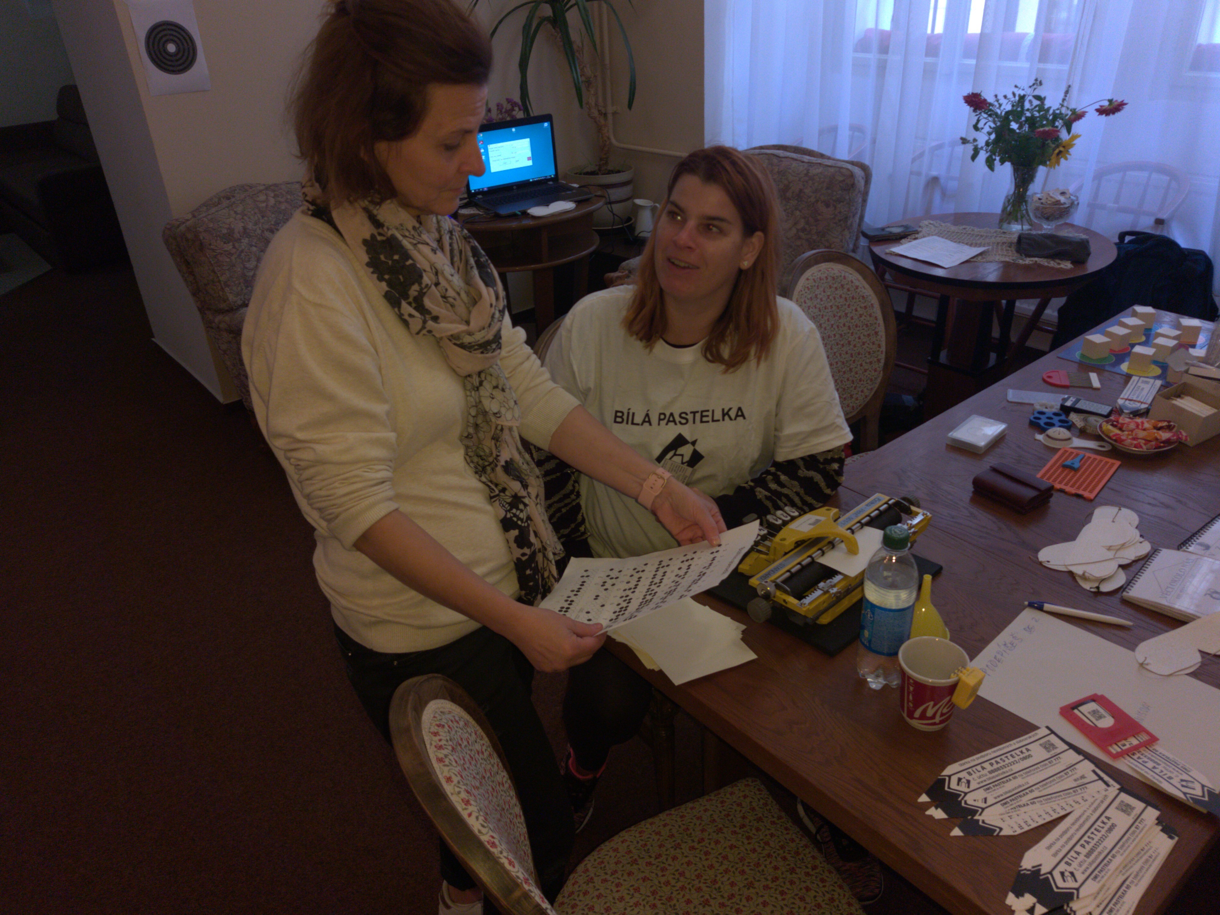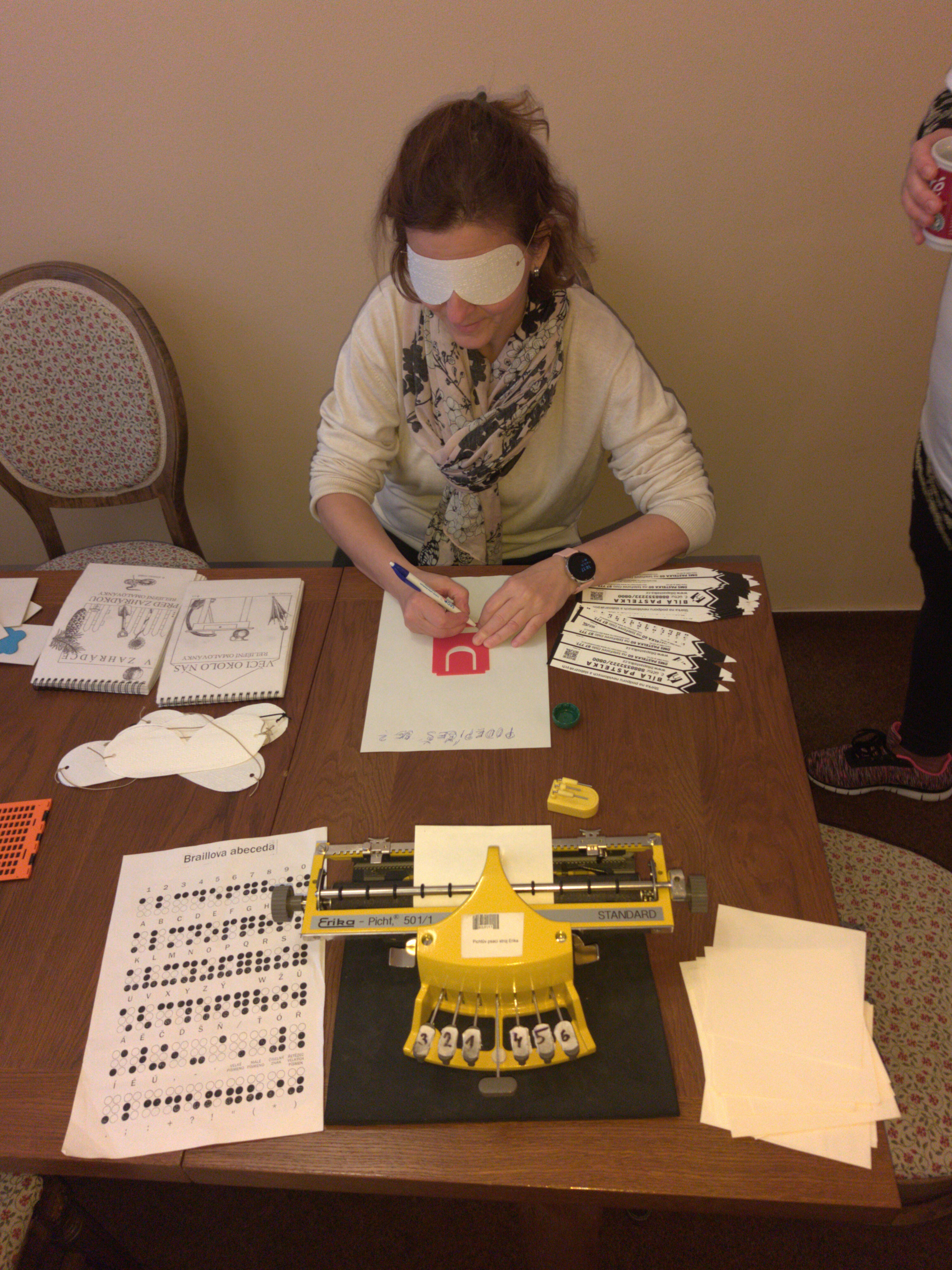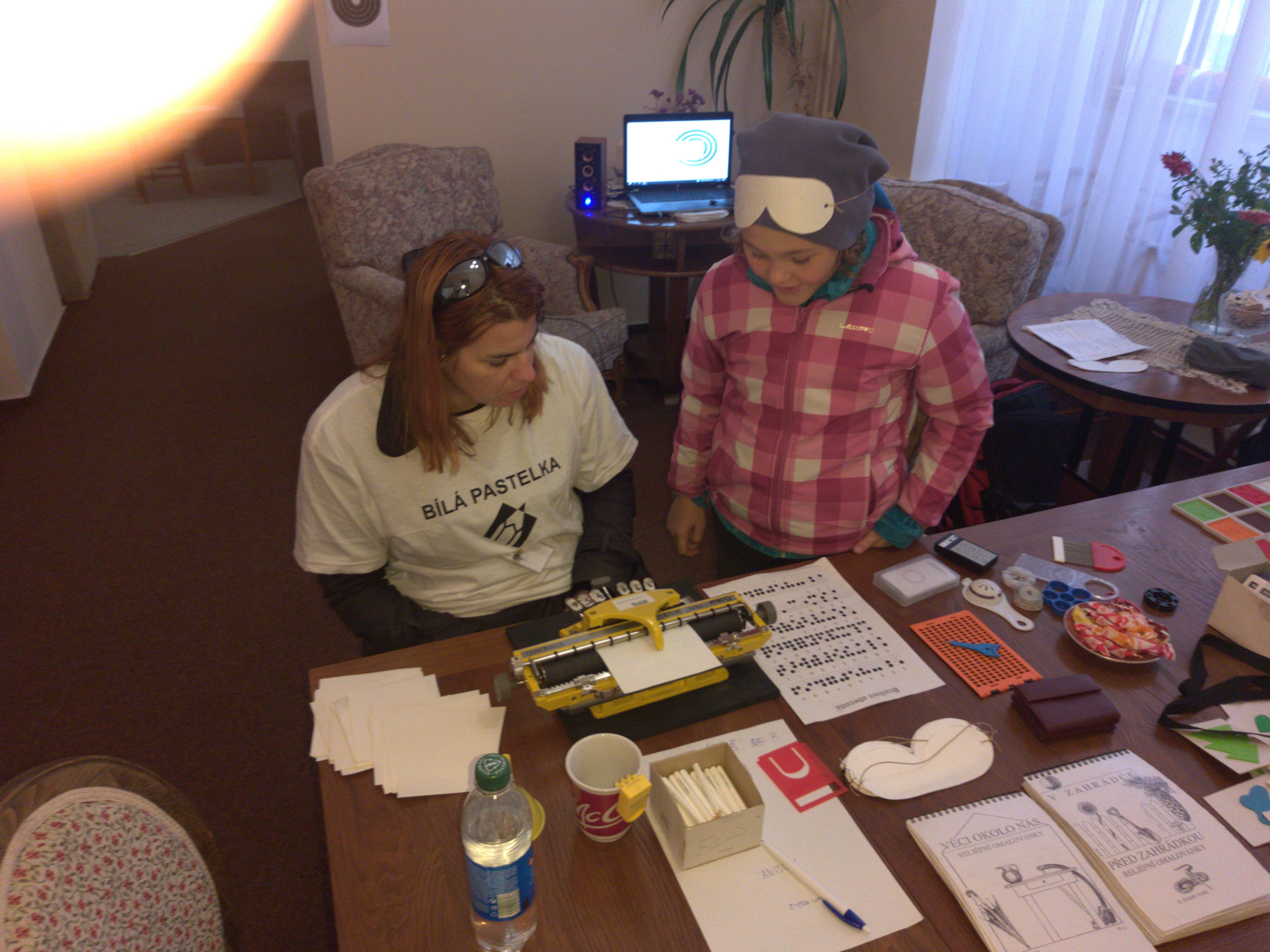 Větší zájem hosté kavárny projevili o ukázku kompenzačních pomůcek a pomůcek pro domácnost. Starší dámy se chtěli především seznámit s Braillovým písmem, úžasným objevem nevidomého studenta. I děti si u nás přišly na své. Hrály zvukové a hmatové pexeso, poznávaly reliéfní obrázky a vyzkoušely si zvukovou střelbu.