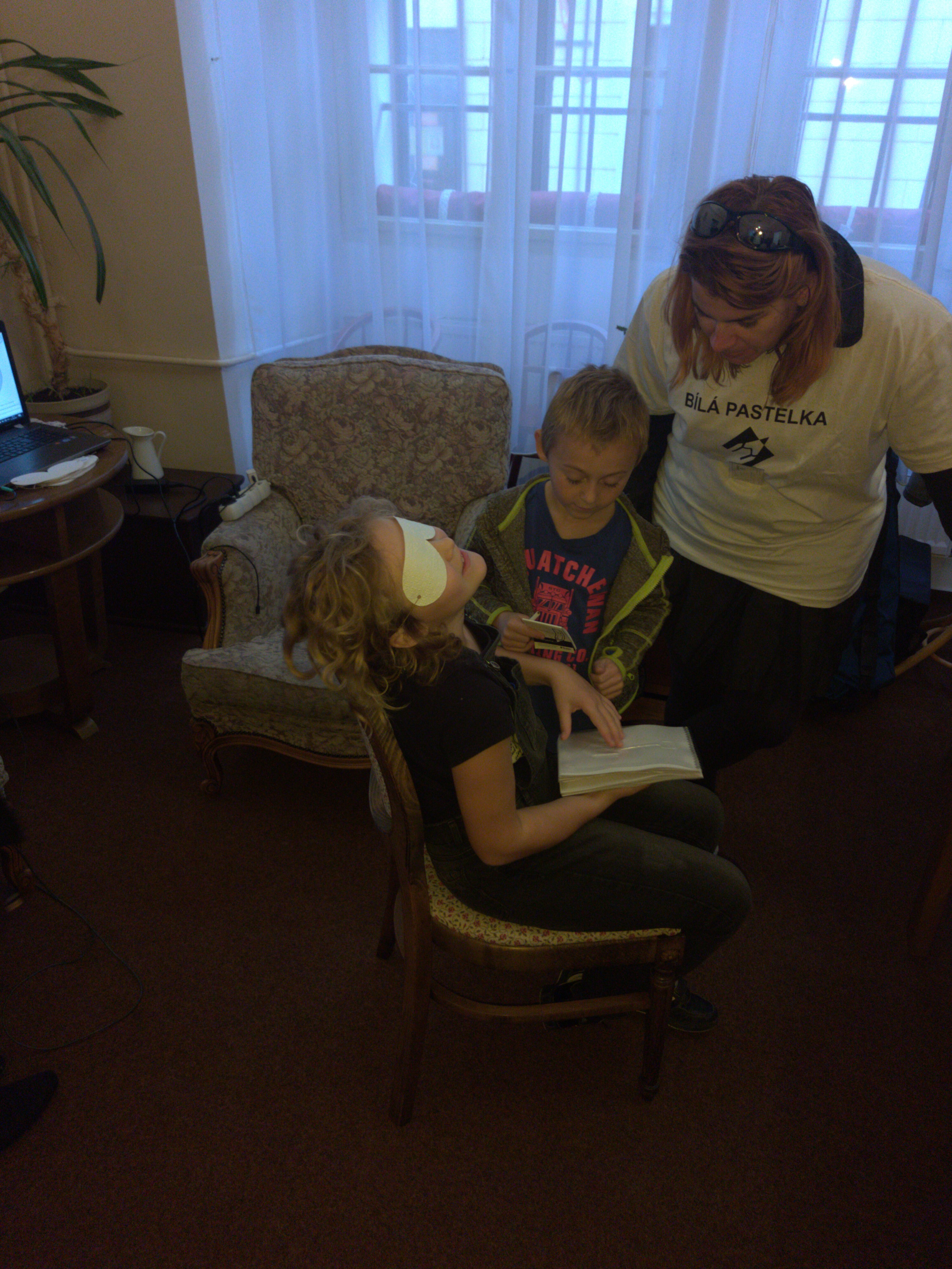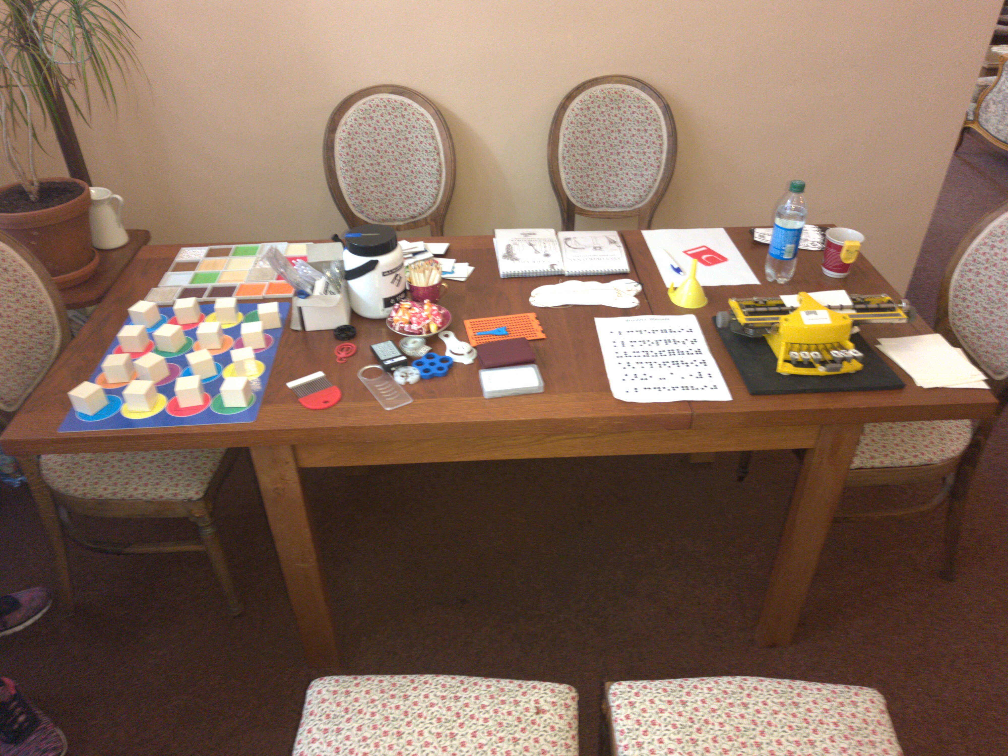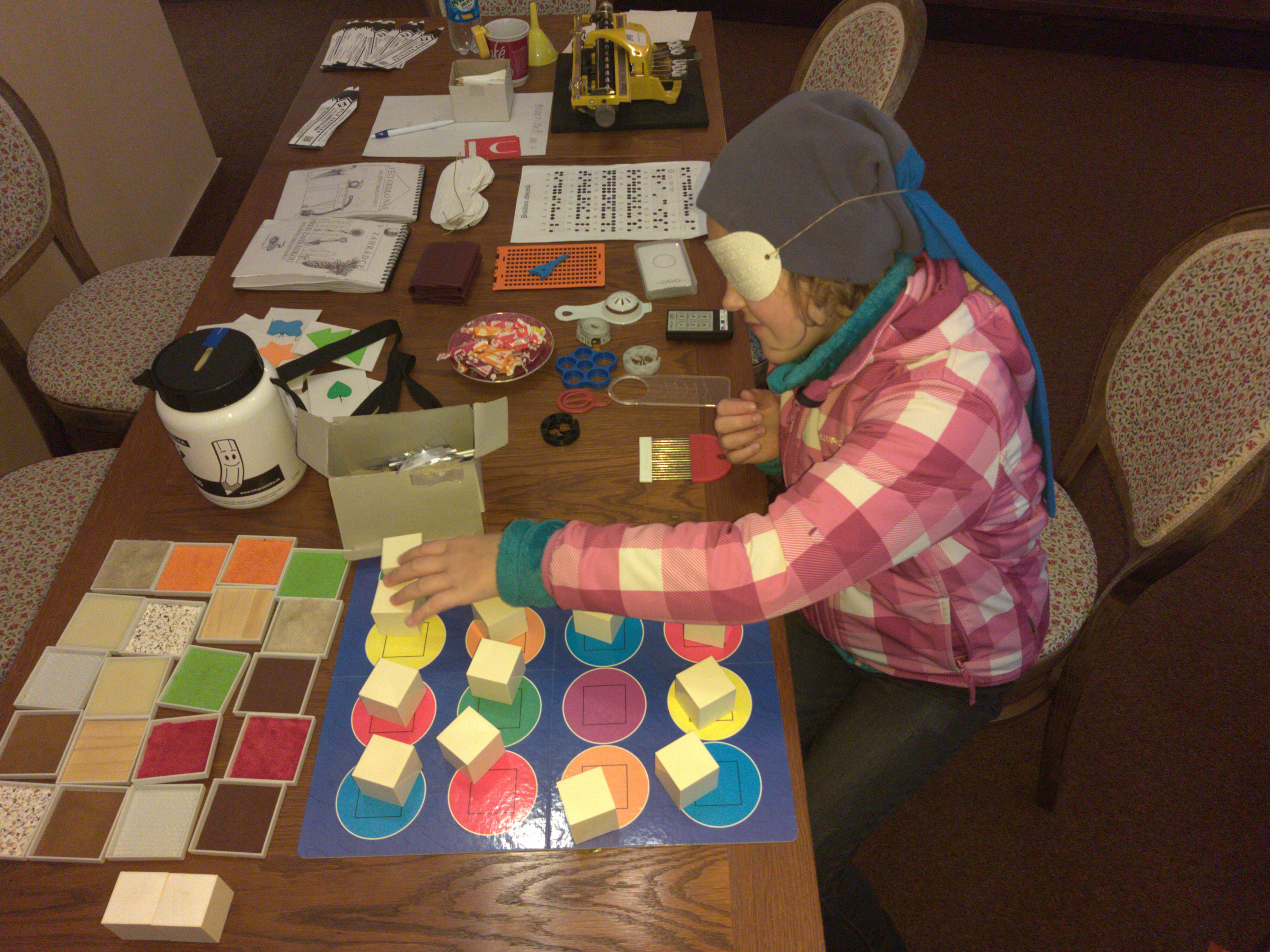 Větší zájem hosté kavárny projevili o ukázku kompenzačních pomůcek a pomůcek pro domácnost. Starší dámy se chtěli především seznámit s Braillovým písmem, úžasným objevem nevidomého studenta. I děti si u nás přišly na své. Hrály zvukové a hmatové pexeso, poznávaly reliéfní obrázky a vyzkoušely si zvukovou střelbu.