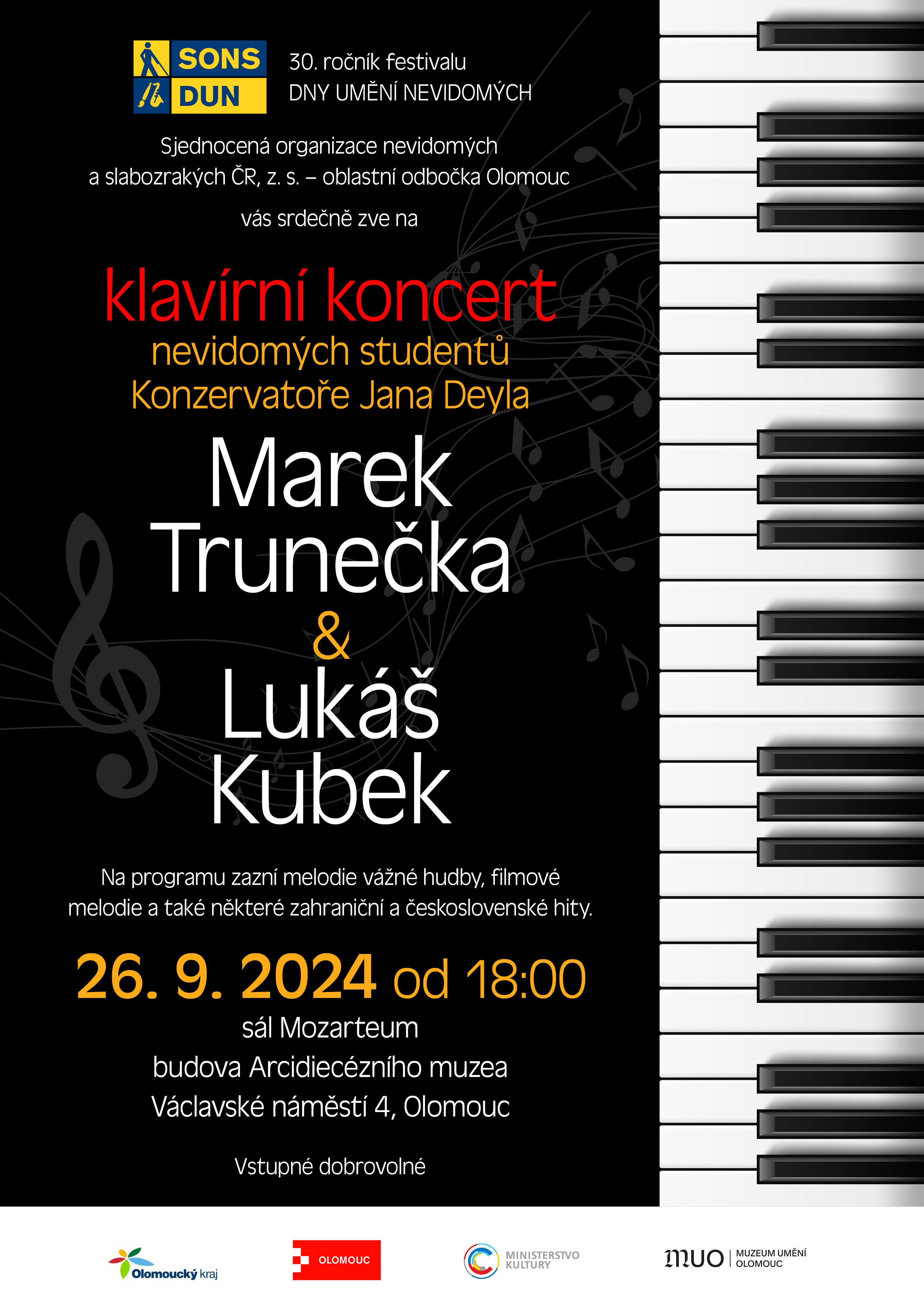 Sjednocená organizace nevidomých a slabozrakých ČR - oblastní odbočka Olomouc vás v rámci 30. ročníku festivalu Dny umění nevidomých srdečně zve na klavírní koncert Marka Trunečky a Lukáše Kubka, nevidomých studentů Konzervatoře Jana Deyla.
