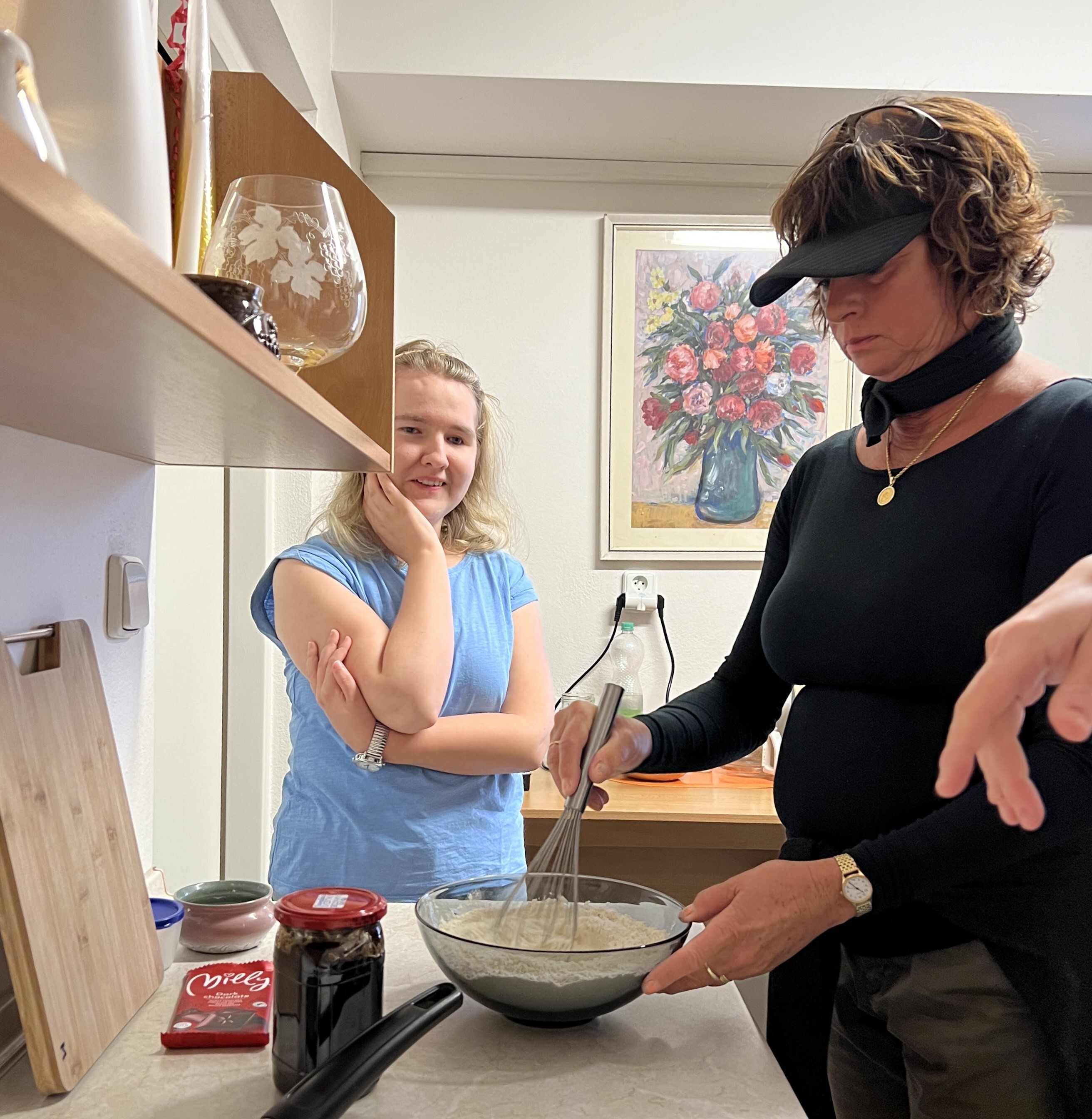 Sladká varianta - domácí marmelády (meruňková, borůvková, višně v čokoládě), šlehačka a rozpuštěná čokoláda