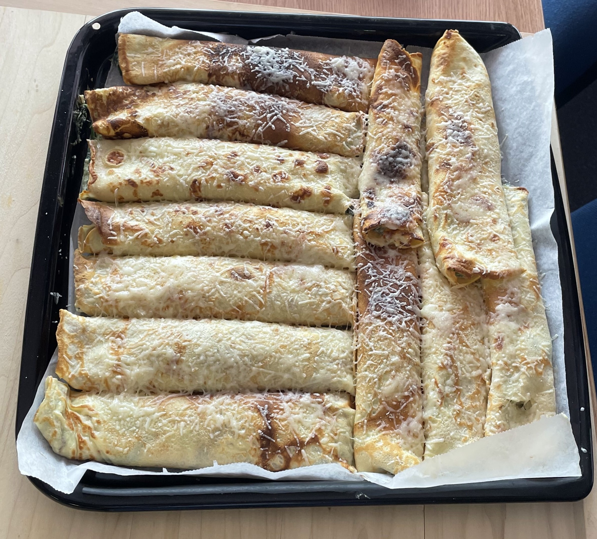 Slaná varianta - náplň ze špenátu a sýra ricotta, posypané parmazánem a zapečené v troubě