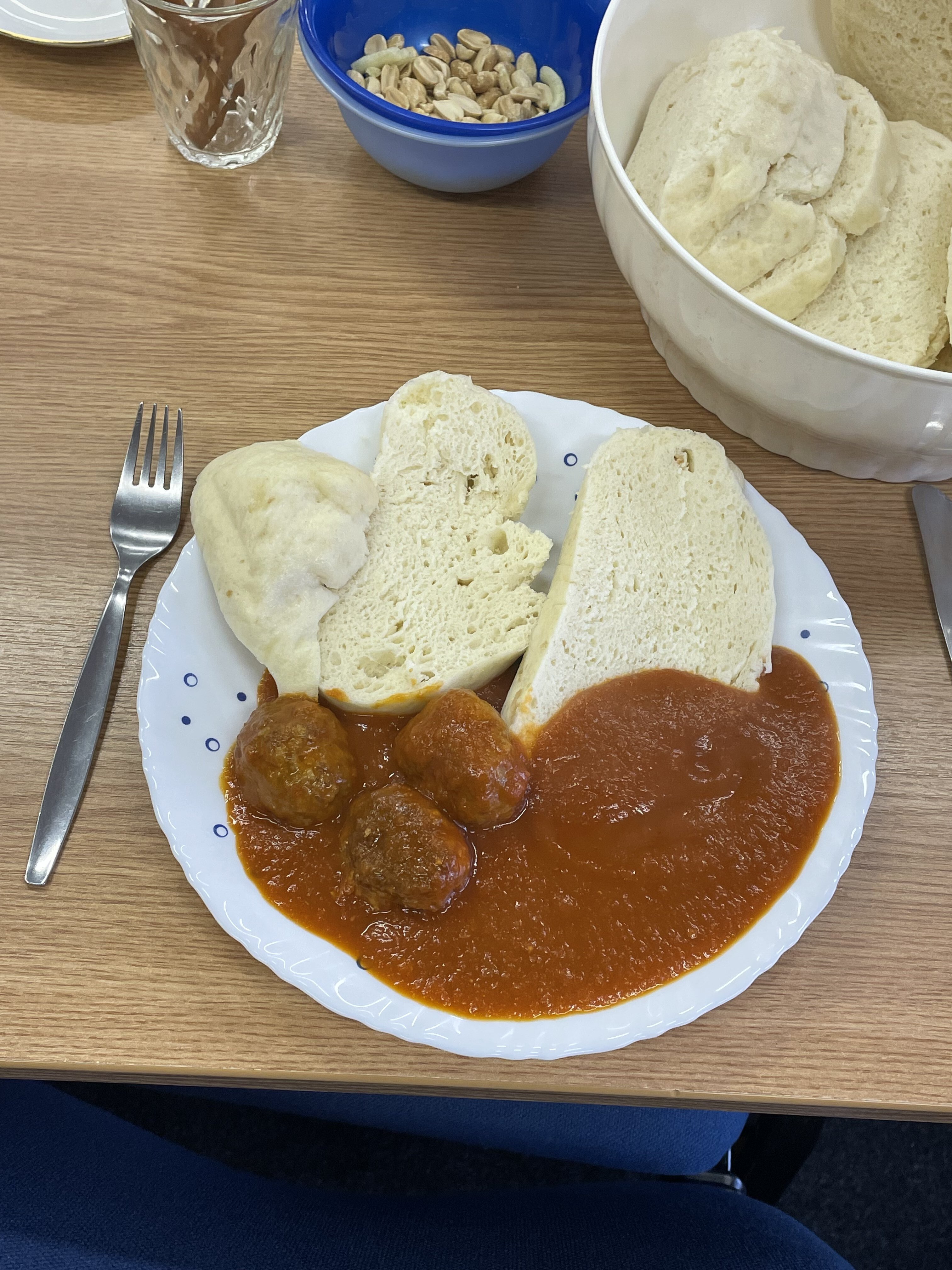 Tentokrát jsme si připravili domácí rajskou omáčku s masovými kuličkami a domácím houskovým knedlíkem.